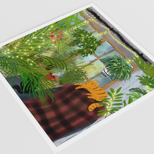 Unframed Art Print: Snowy Autumn Garden with Cats