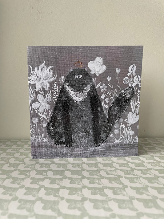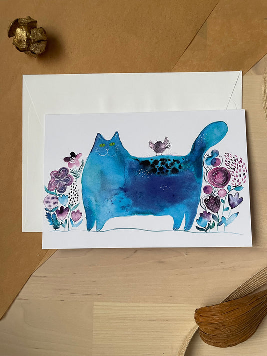 Horizontal Greeting card: Cat with flowers/ Blue cat amongst flowers