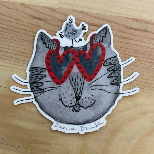 Sticker: Grey Cat Head in Red Heart-Shaped Glasses
