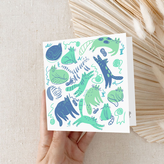 Carte de vœux carrée : Chats et fils – Chats joueurs en vert et bleu