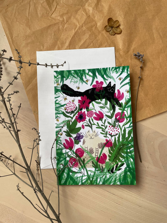 Carte de vœux verticale : Jardin de chats fantaisistes