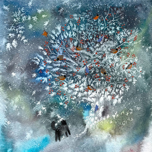 Impression d’art de chat : Chat observant les oiseaux en hiver/ Œuvre d’art de chat/ Tentures murales/ Impression d’art en papier