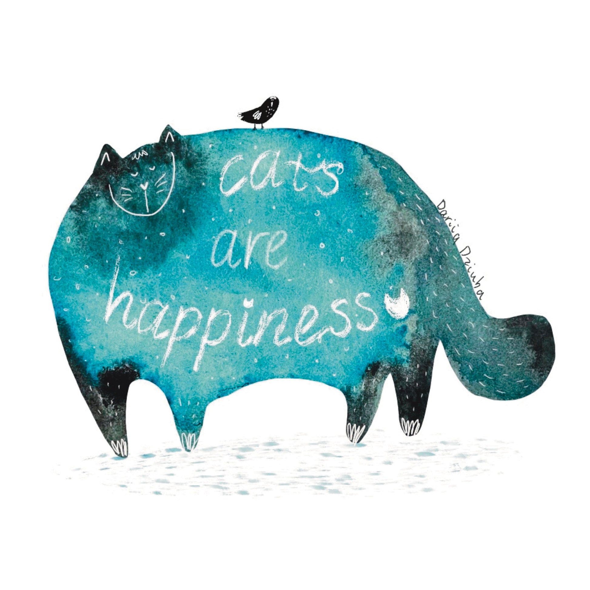 L'impression d'art d'un chat bleu avec l'inscription « Les chats sont le bonheur » avec un oiseau sur le dessus est imprimée sur du papier d'art de haute qualité.