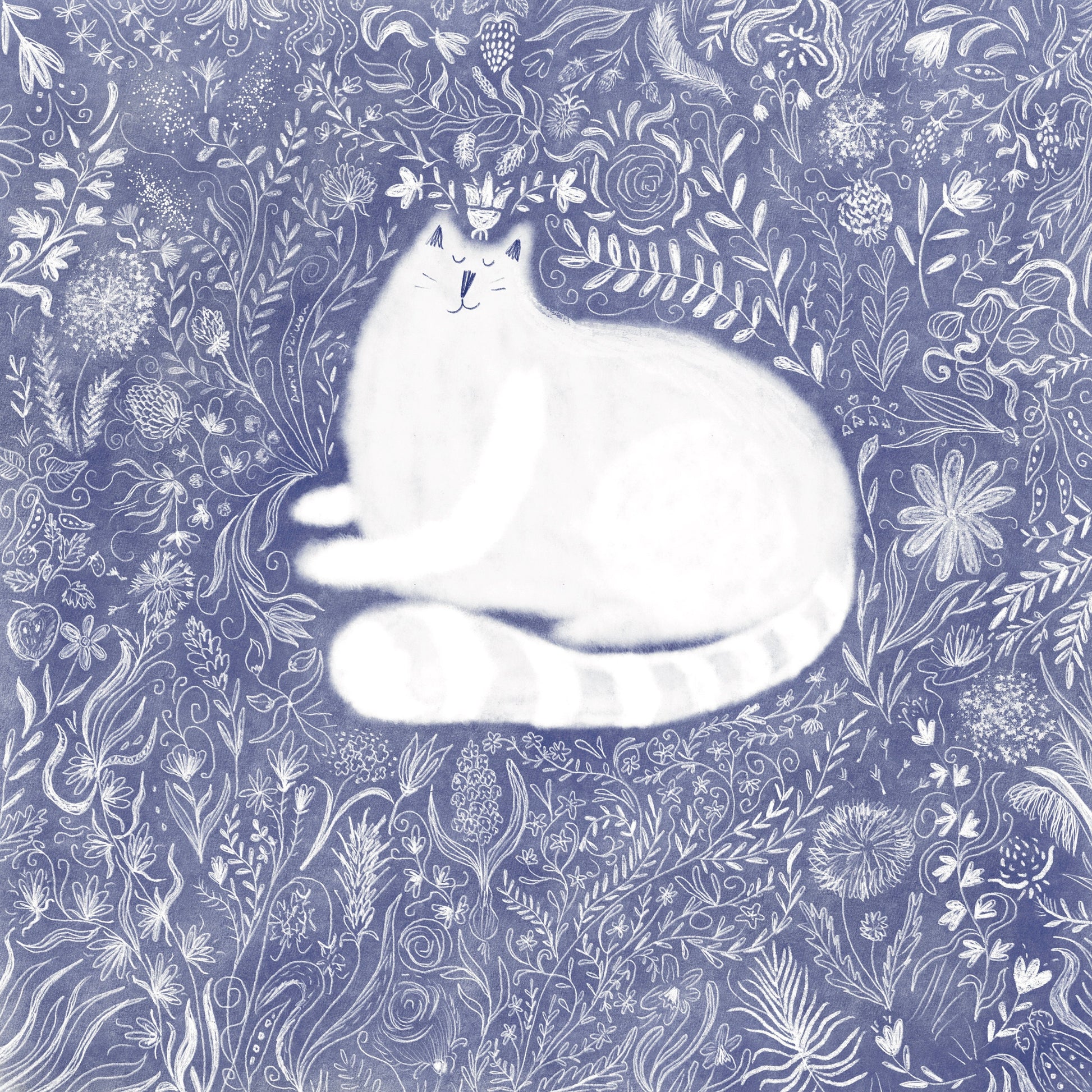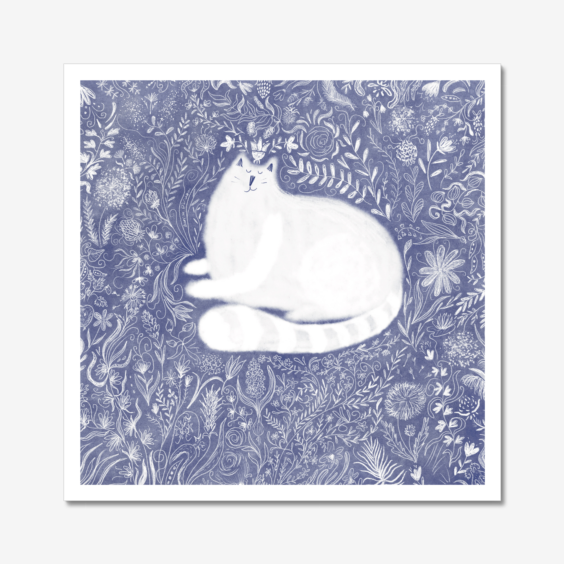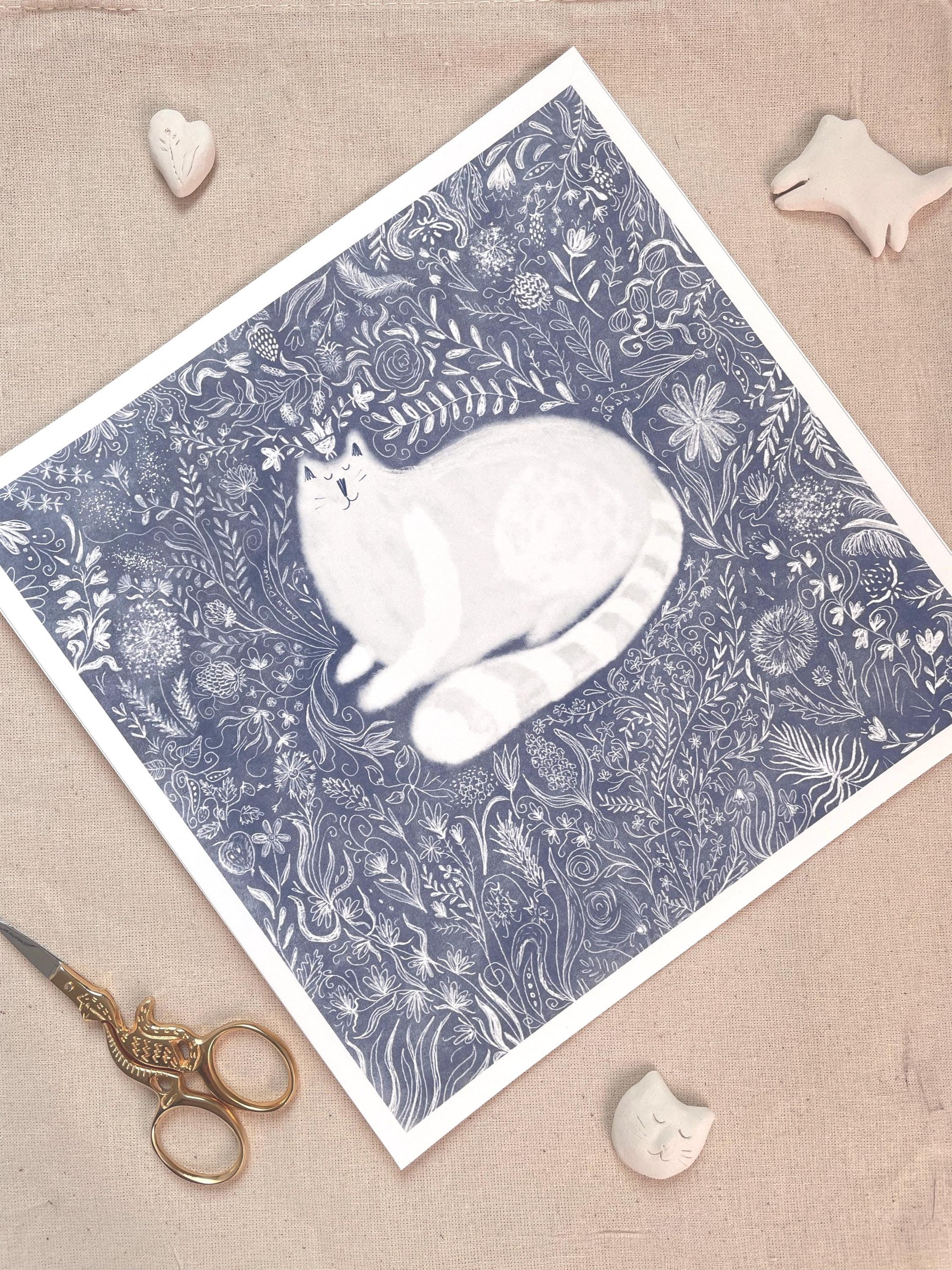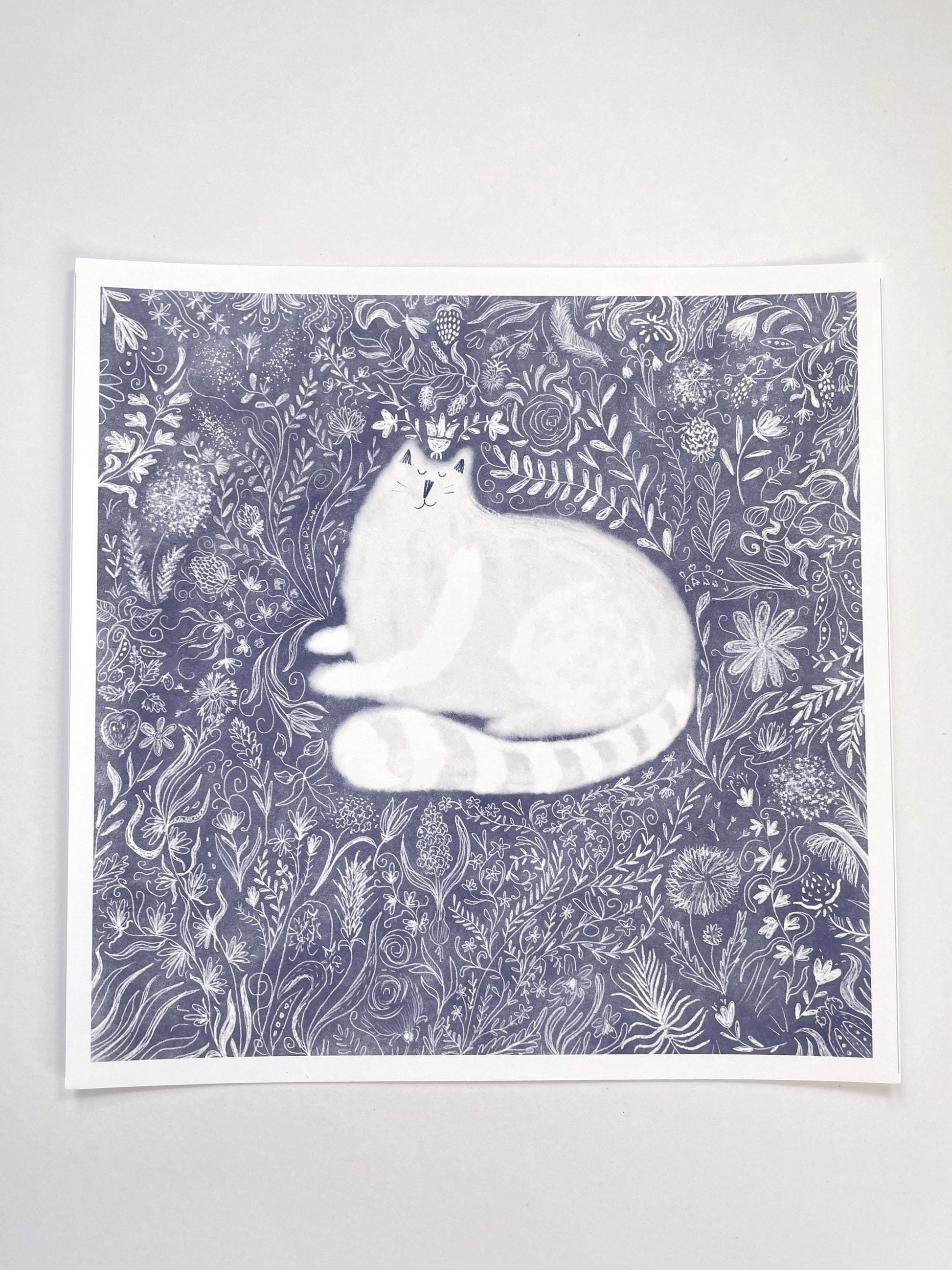 L'impression d'art d'un chat dans des fleurs griffonnées est imprimée sur du papier d'art de haute qualité.