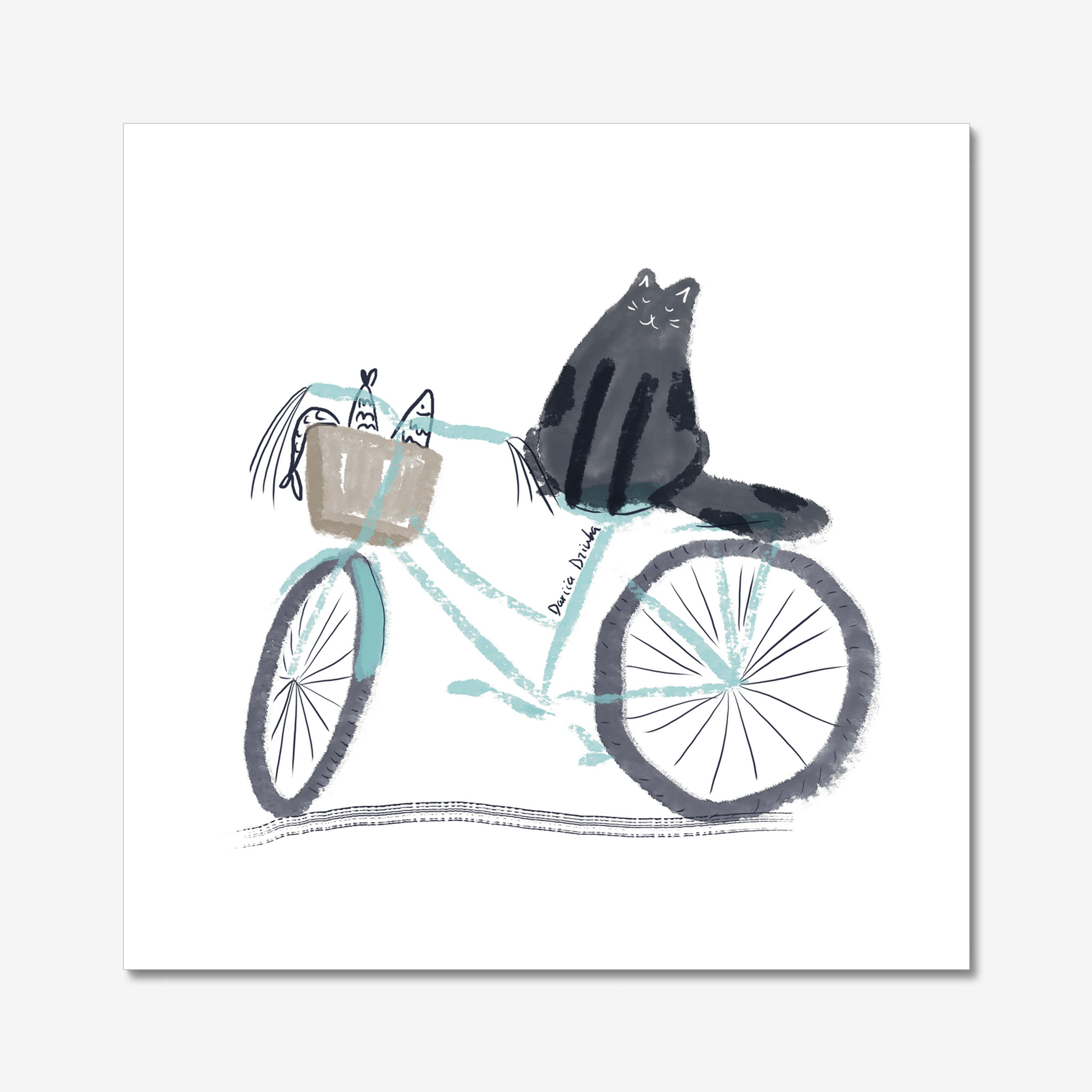 L'impression d'art d'un chat sur un vélo faisant les courses est imprimée sur du papier d'art de haute qualité.
