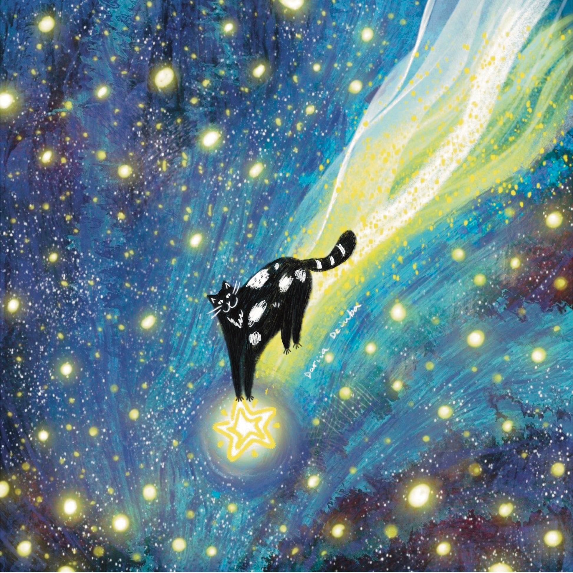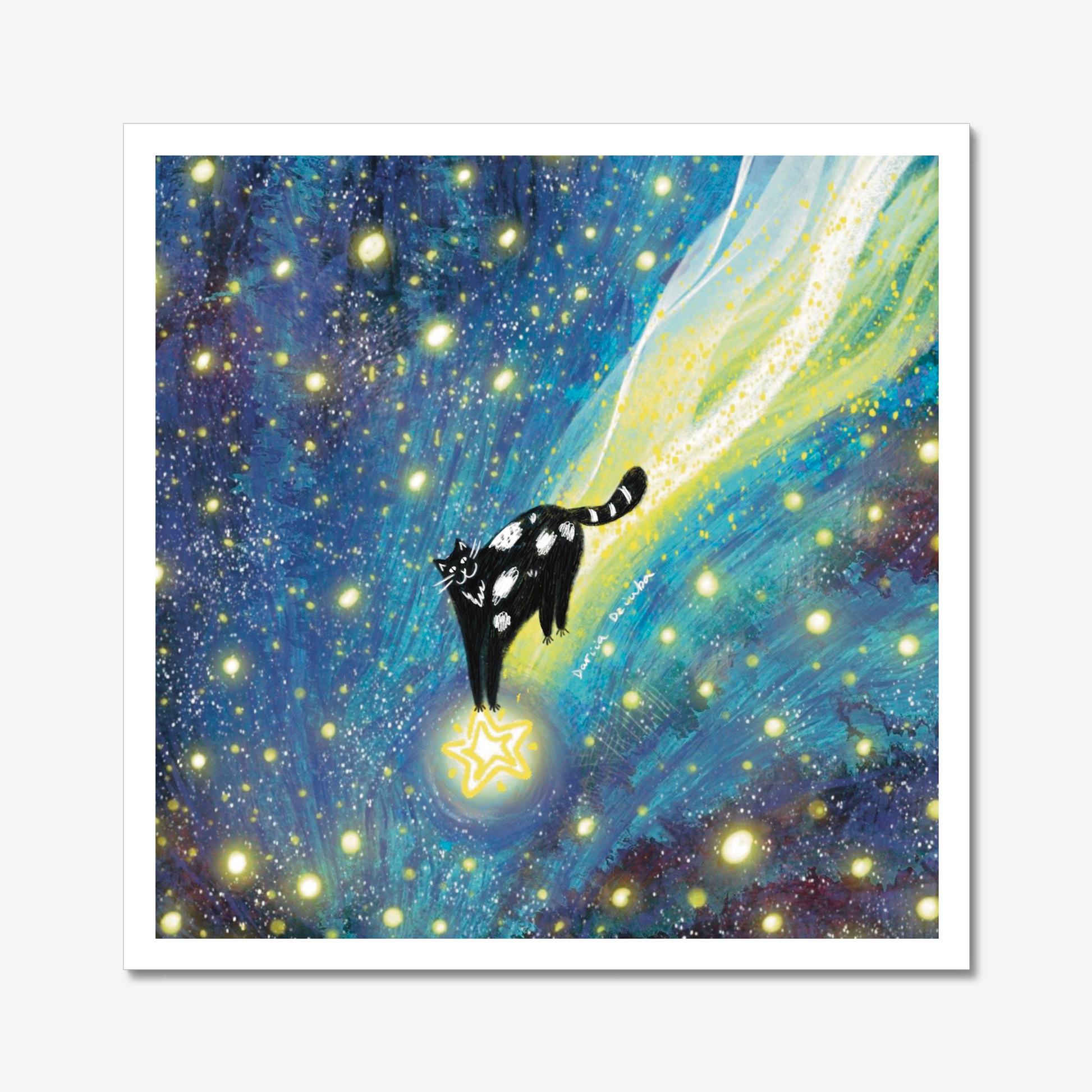 L'impression d'art d'un chat chevauchant une étoile filante dans un ciel étoilé est imprimée sur du papier d'art de haute qualité.