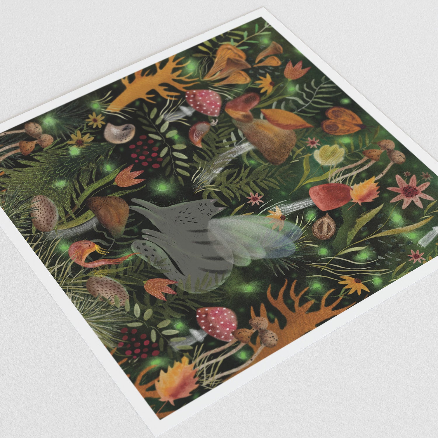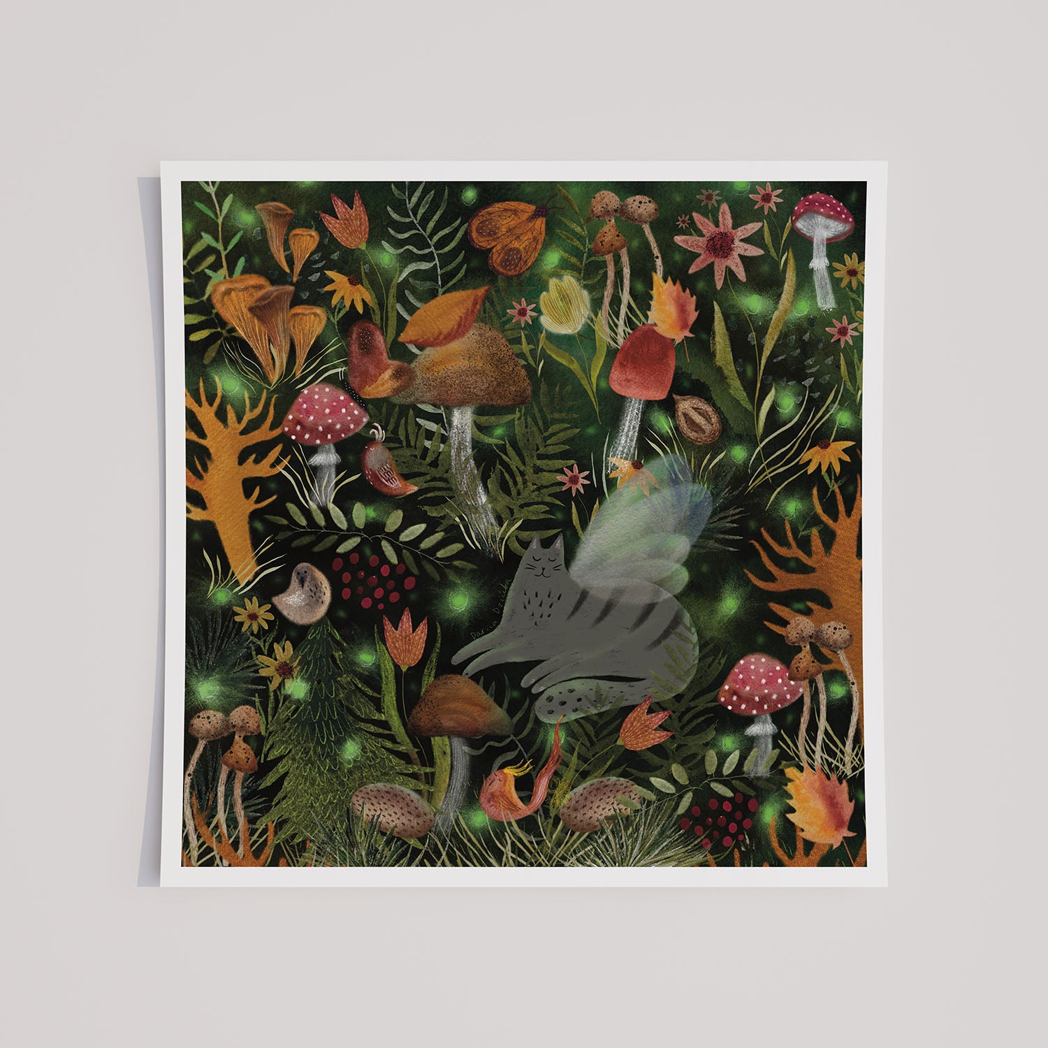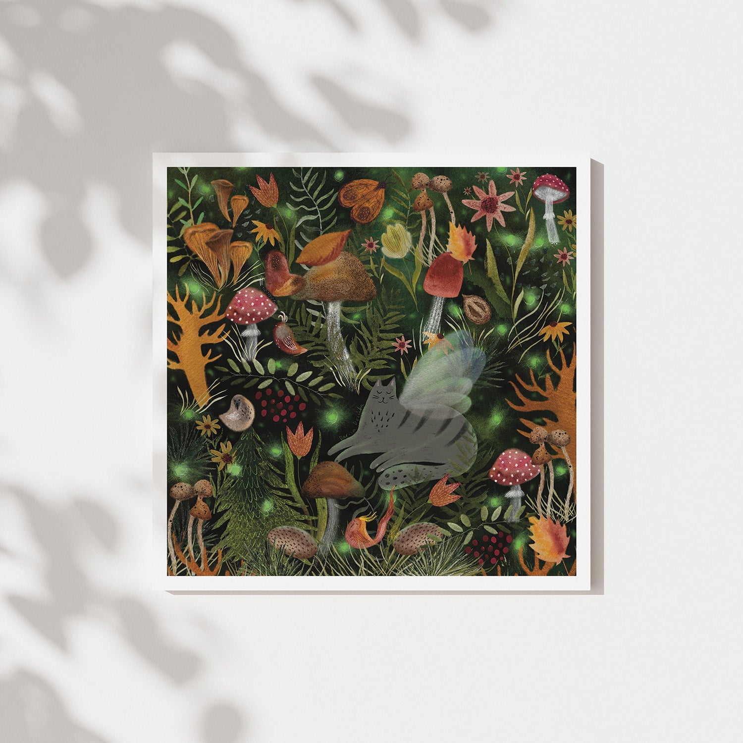 L'impression d'art sans cadre d'un chat féerique avec des lucioles dans une forêt magique est imprimée sur du papier d'art de haute qualité.