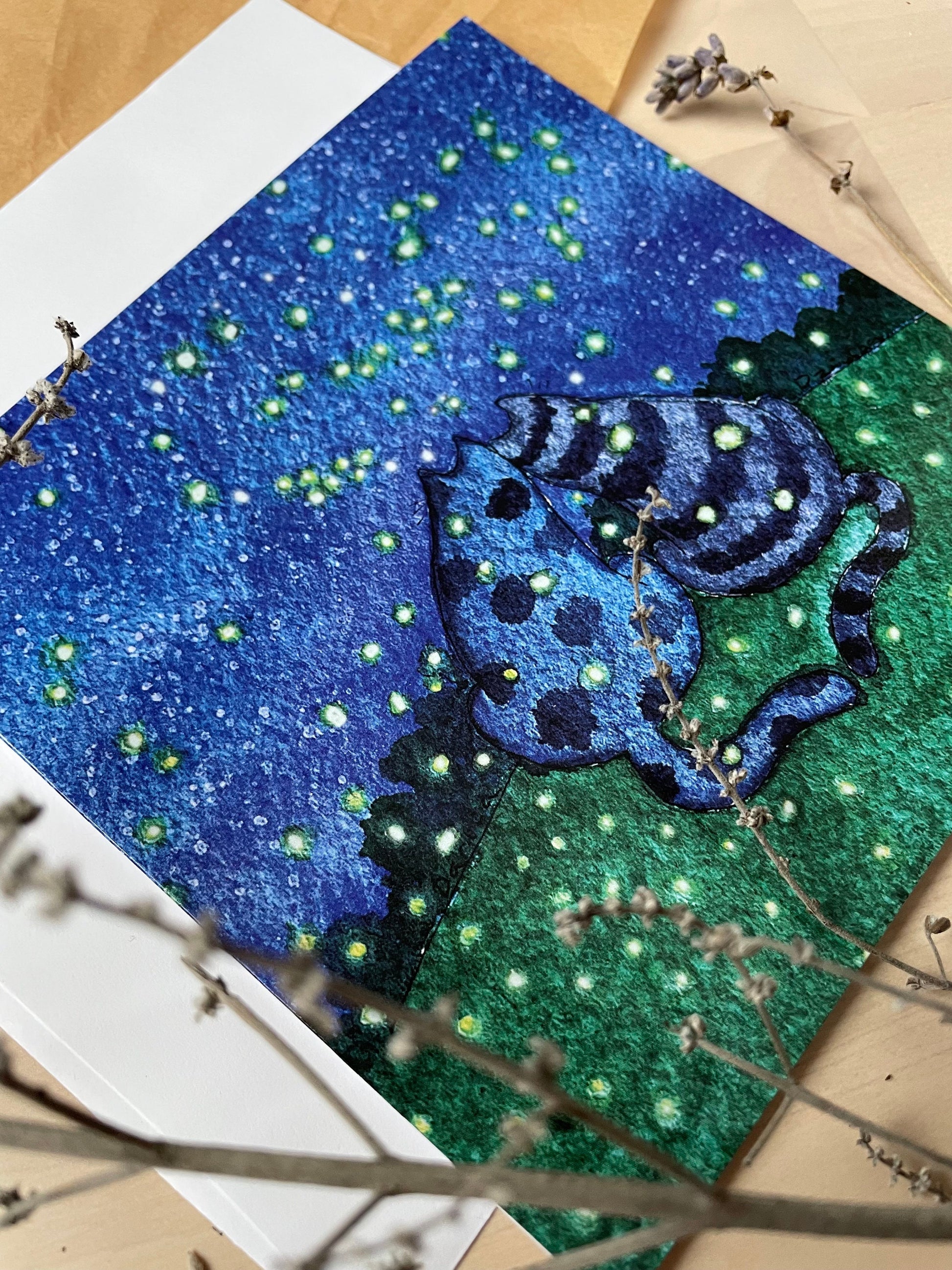 Cette carte de Saint-Valentin sur le thème du chat est une façon charmante et ludique de célébrer cette journée. Dites « Je t'aime » avec cette jolie carte de vœux. Les lucioles qui volent forment une forme de cœur sur l'heureux couple de chats. Ce paysage romantique qui fera fondre le cœur de chacun. J'ai créé cette carte en pensant à quel point il serait romantique d'aller observer les étoiles lors d'une nuit sombre éclairée par des lucioles. L’illustration sur laquelle il est basé était une aquarelle à l’origine avec un peu d’encre blanche utilisée pour créer les étoiles.