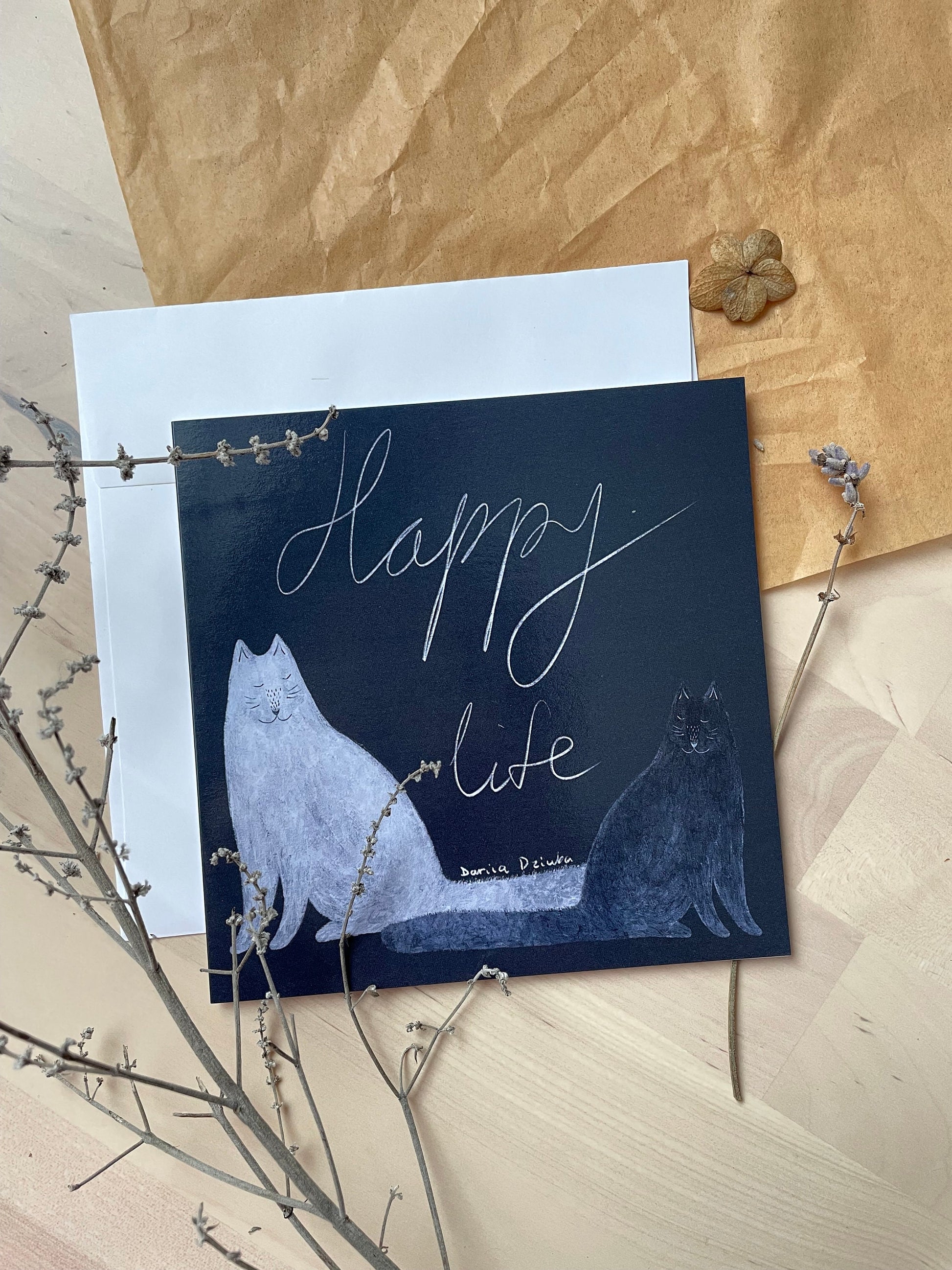 Célébrez l'amour et/ou l'amitié avec la carte « Happy Life ». Le bonheur peut être calme et serein, il s'agit d'aimer les petites choses de notre vie et d'accepter tout tel qu'il est. J'ai créé cette carte en pensant à la façon dont notre vie quotidienne peut nous rendre si heureux lorsque nous réalisons que ce dont nous avons besoin s'y trouve déjà. L'illustration sur laquelle est basée la carte de vœux est une peinture murale que j'ai créée dans ma chambre.
