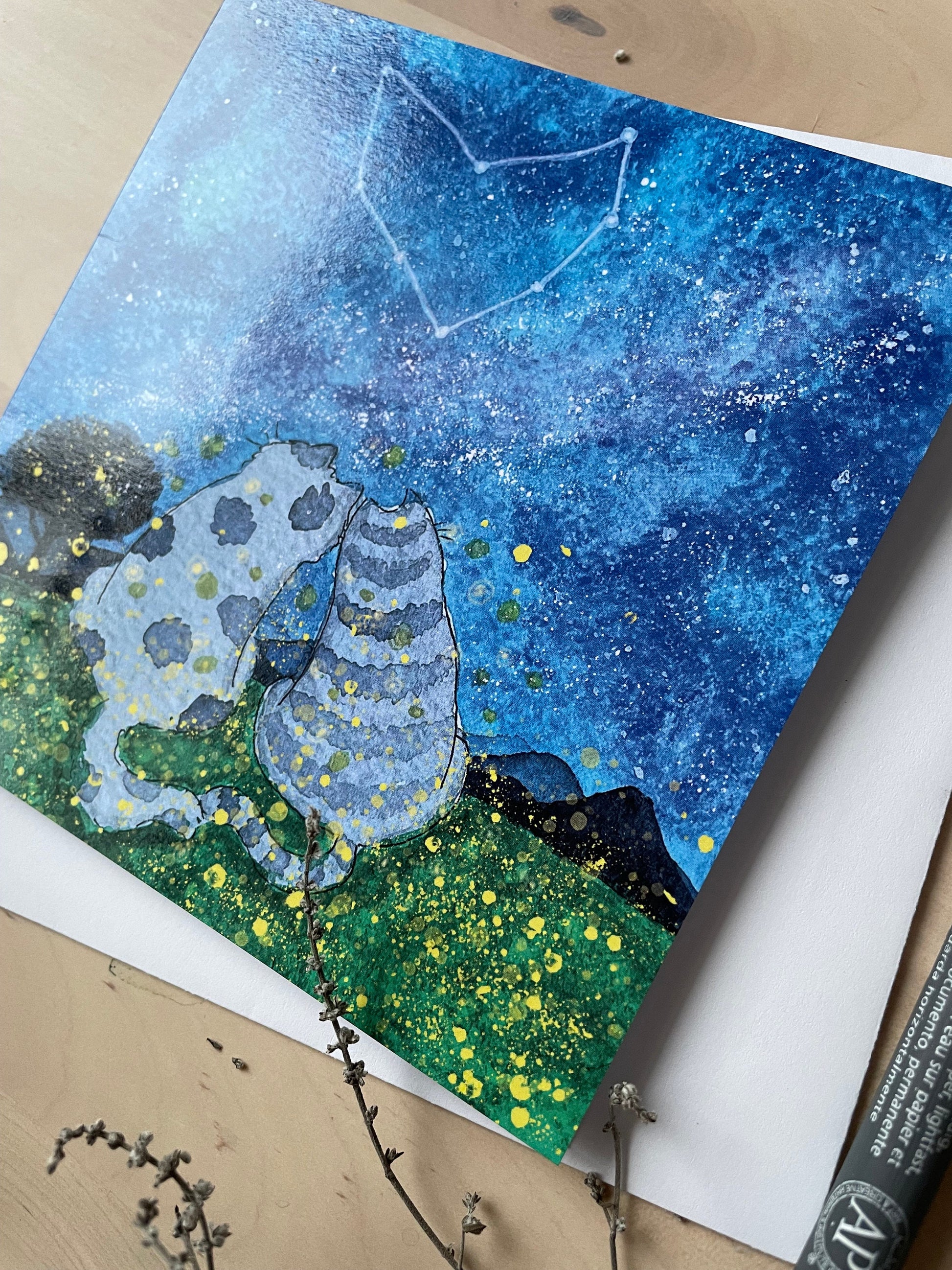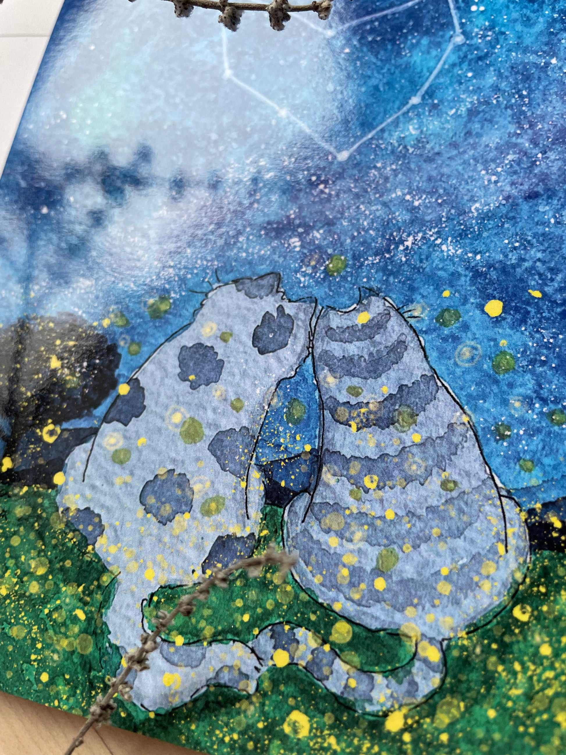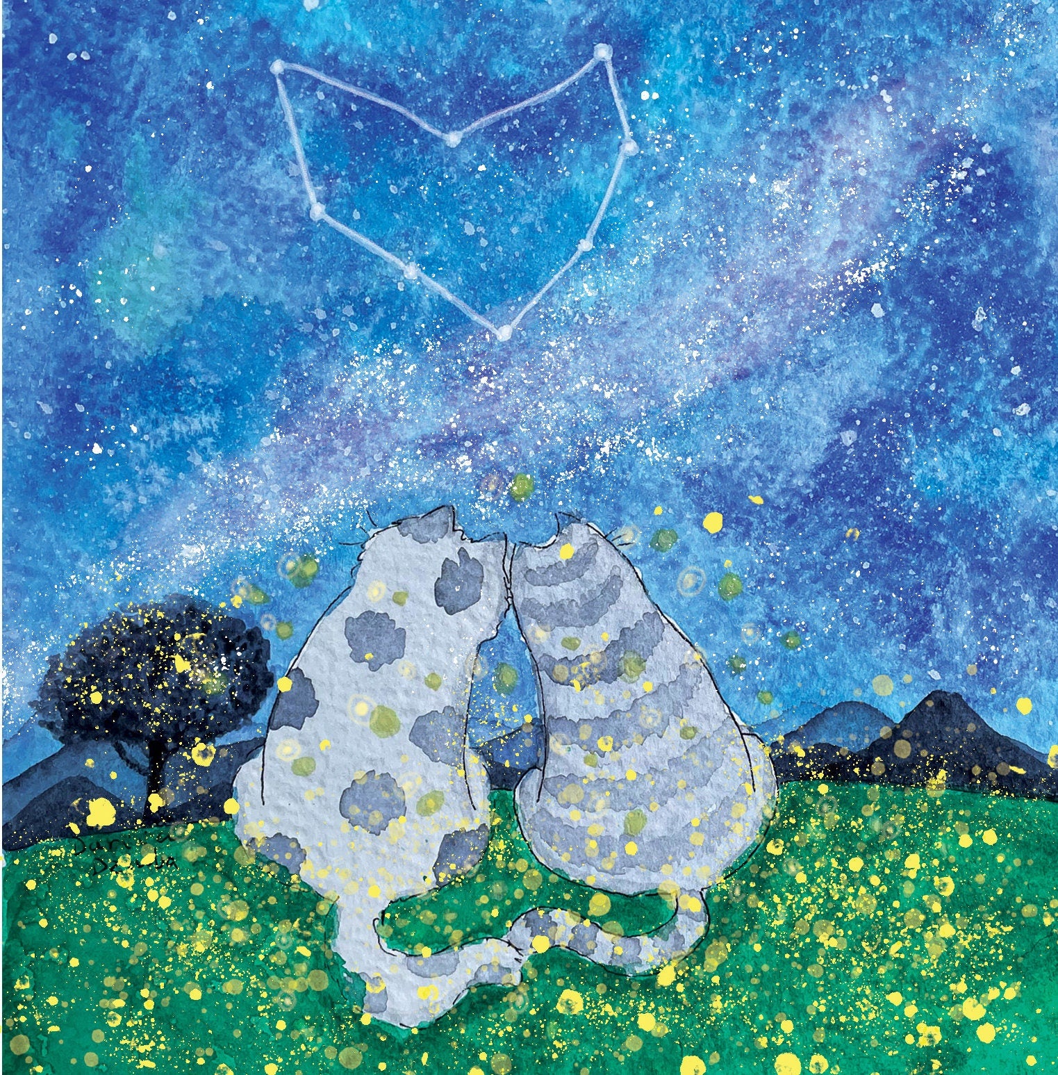 Ce couple de chats regardant une constellation de cœurs vous aidera à exprimer vos sentiments de manière romantique et douce. Les chats sont entourés de lucioles et sont assis sous le ciel proche où des étoiles dispersées forment une constellation de cœurs.