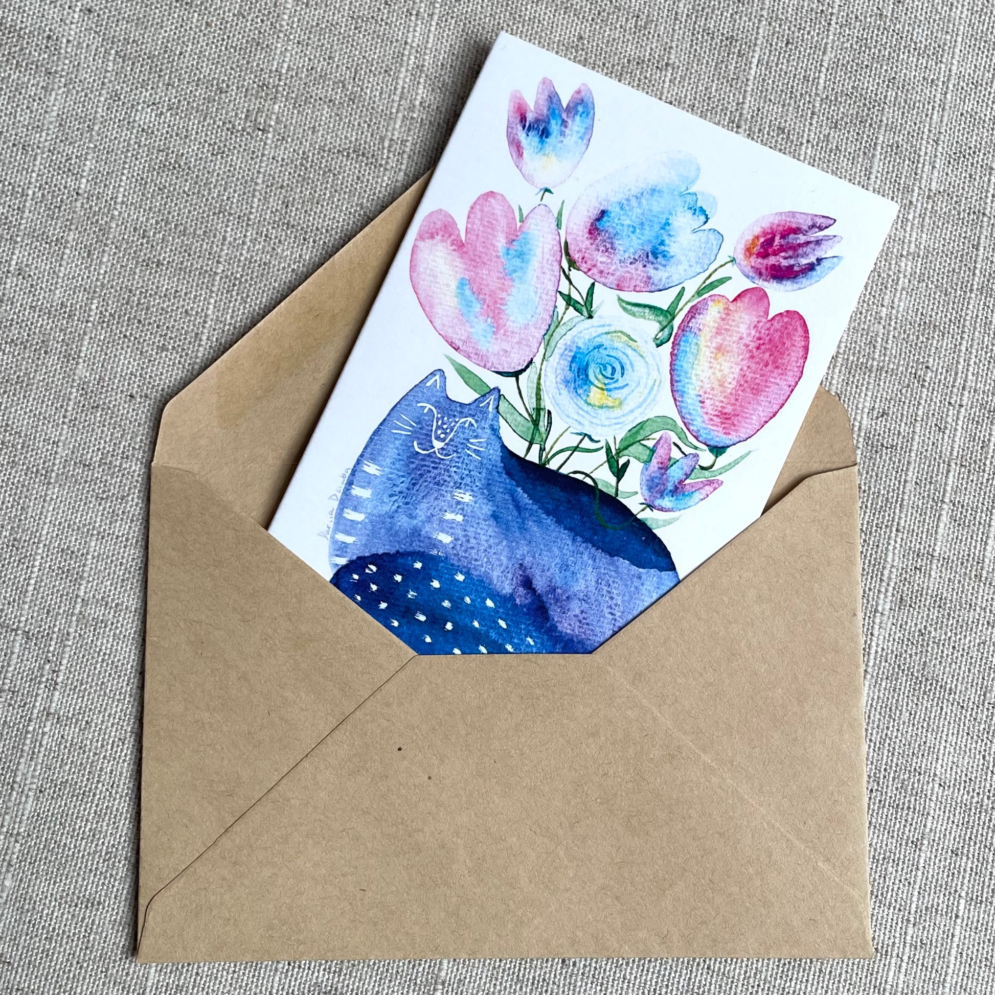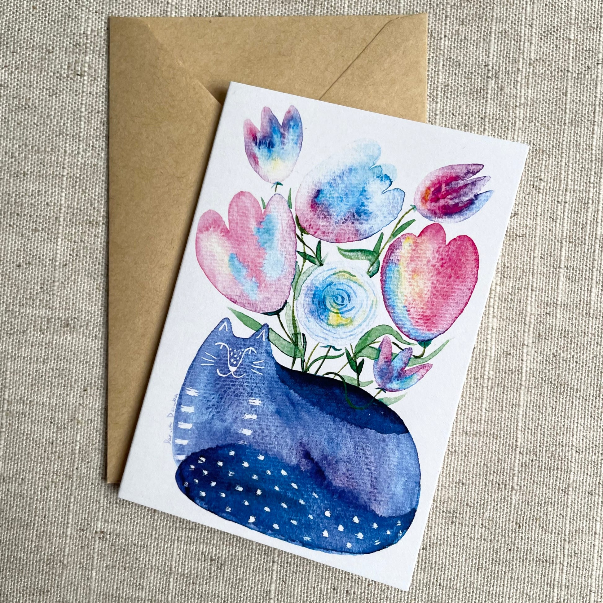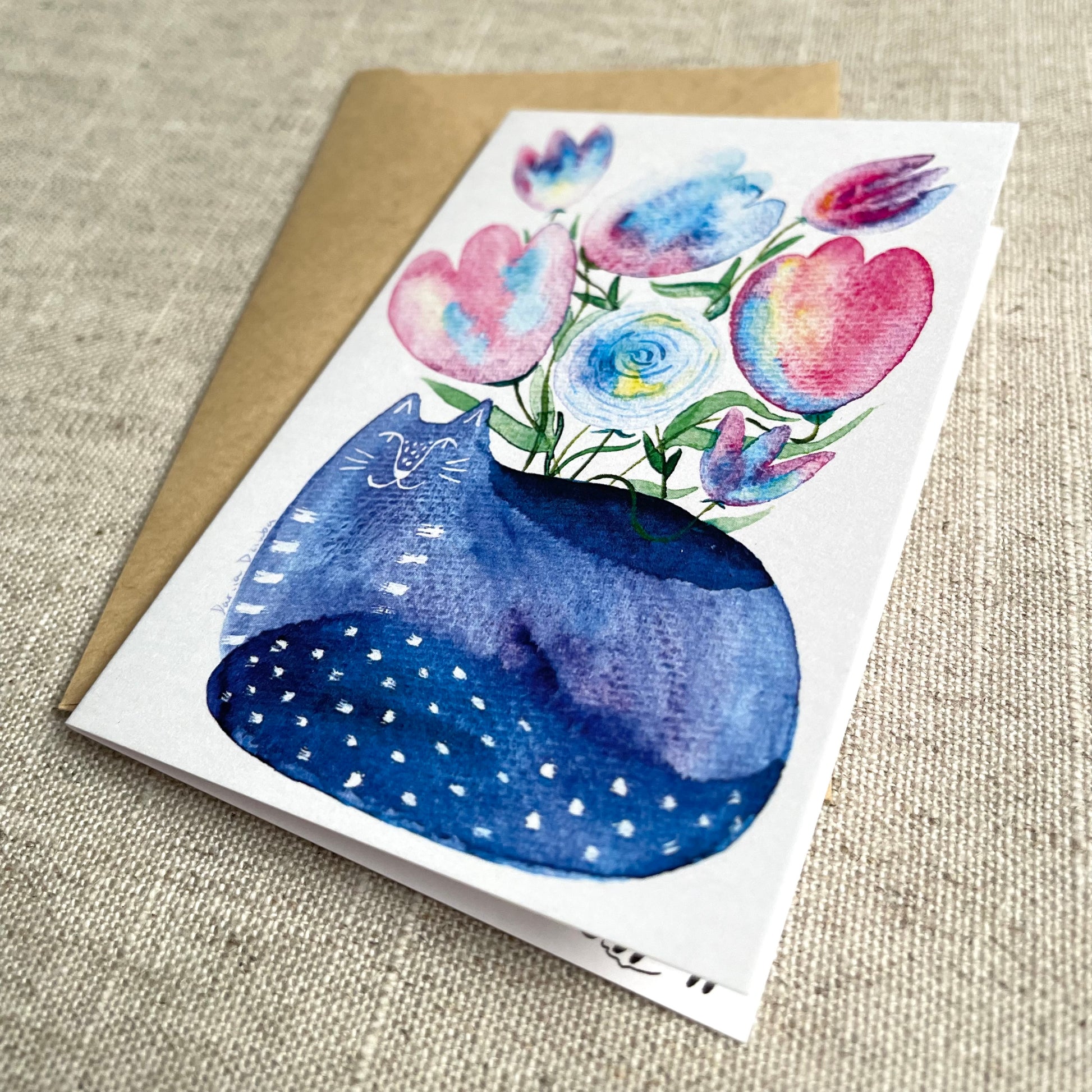 Mini carte : Vase chat assis avec fleurs