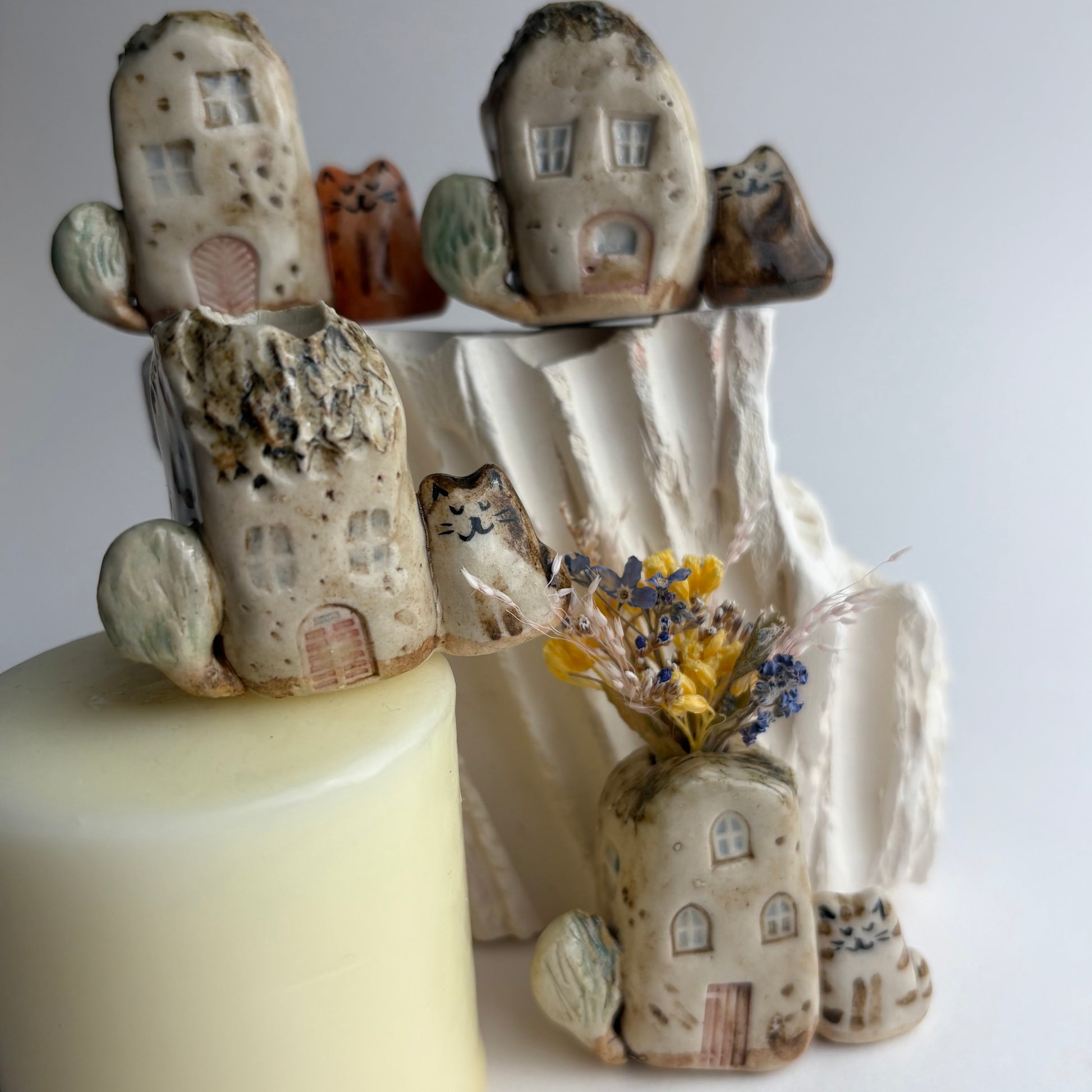 A tiny handmade ceramic bud vase crafted from warm, creamy clay in sepia colours and shaped into an adorable miniature house, a cat and a tree. Each vase is finished with hand-painted details and a soft glossy glaze. Perfect for a single dried stem or a very small fresh clipping. A gentle, sculptural accent for shelves, desks, and gifting.