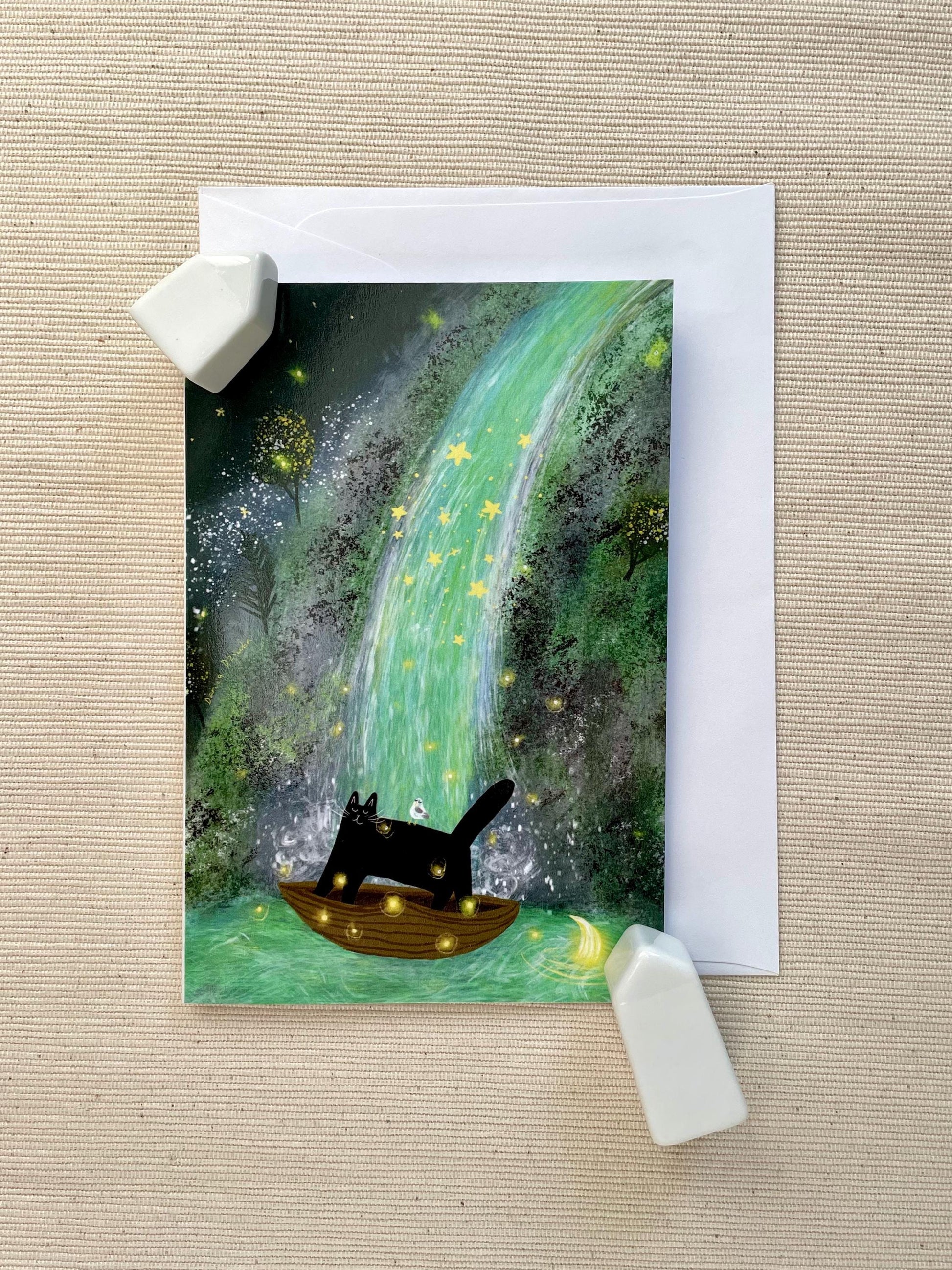 - Design magique : un chat noir dans un bateau naviguant sur une cascade étoilée