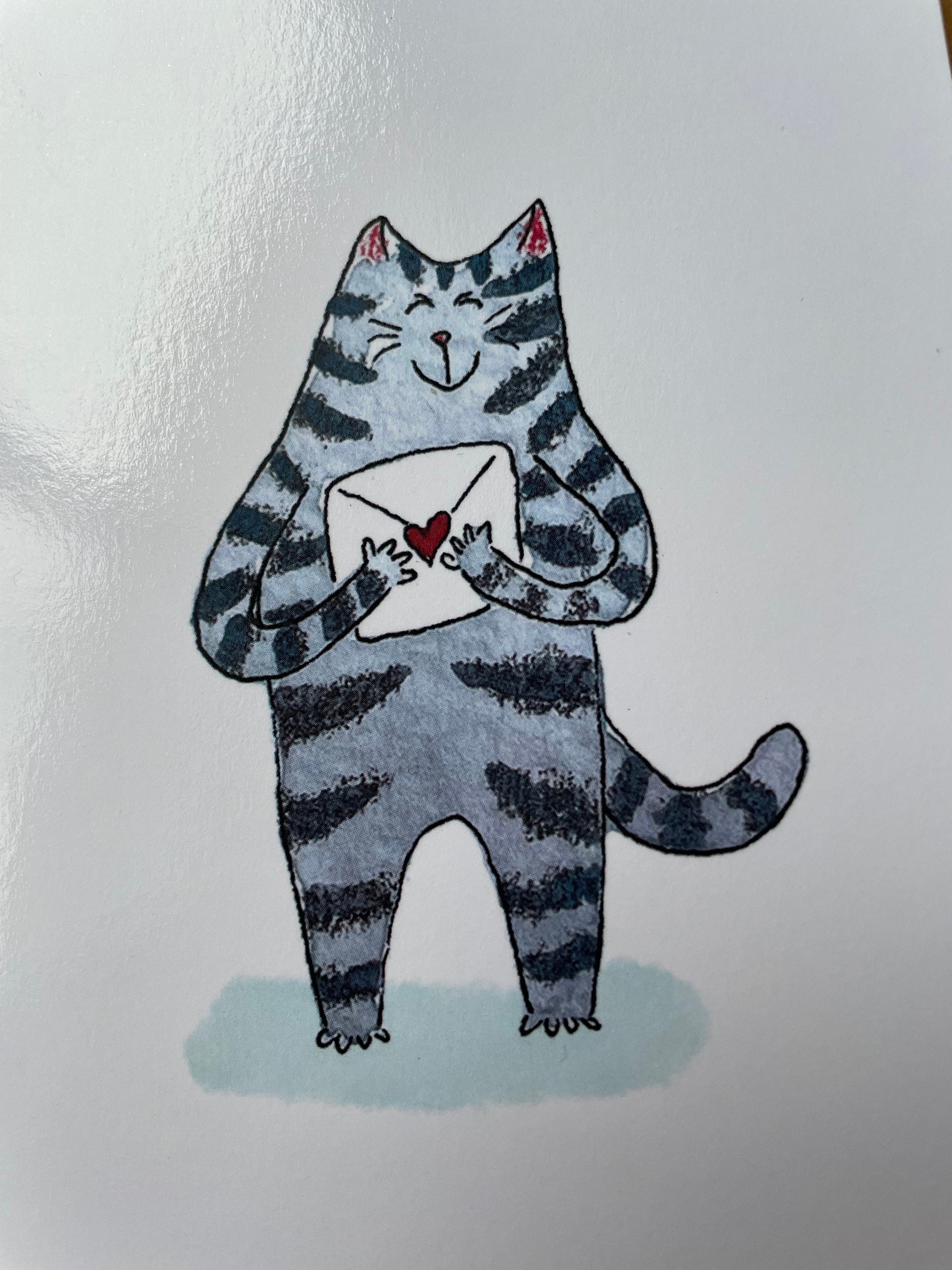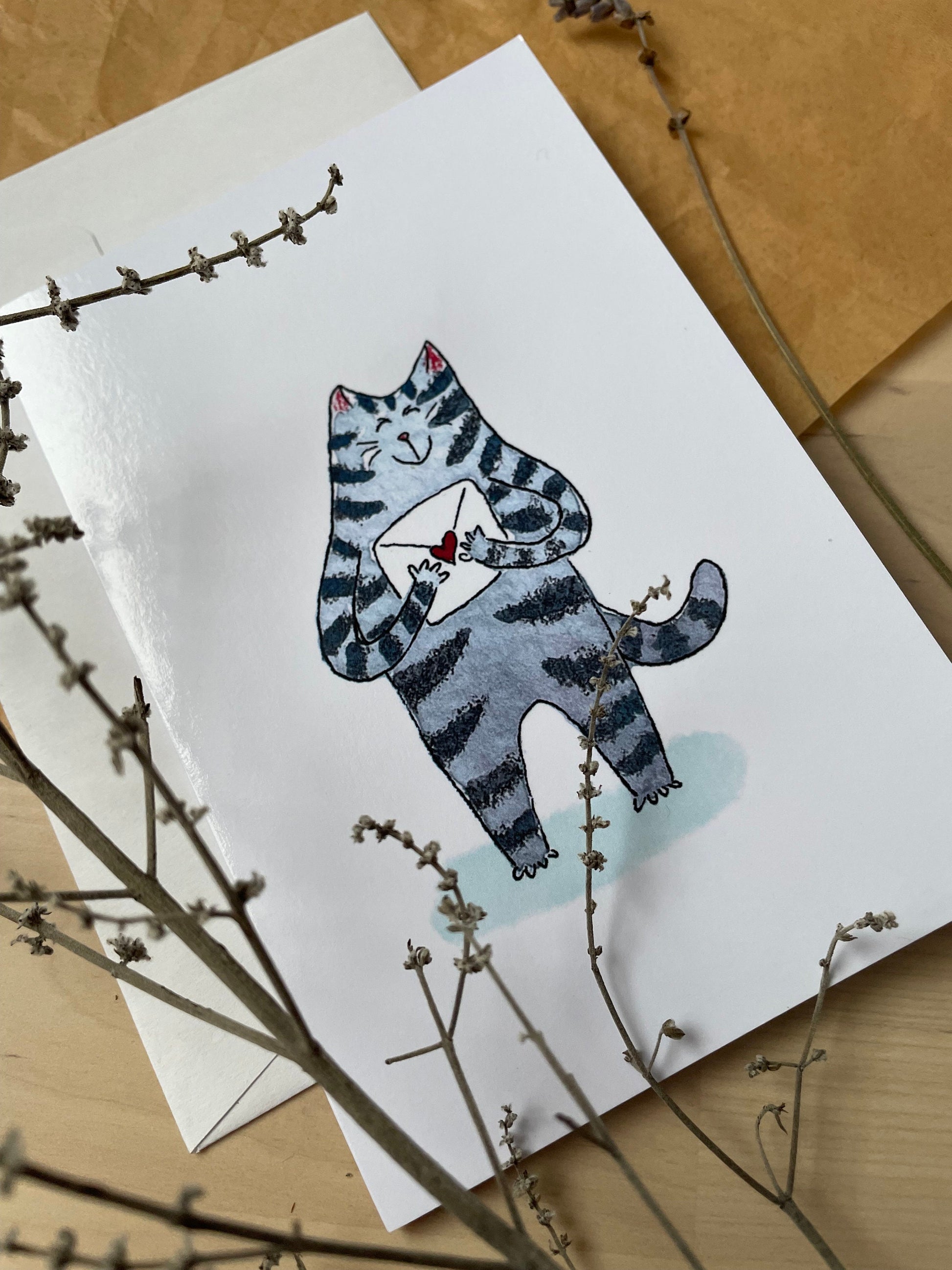 Célébrez la Saint-Valentin ou la Saint-Valentin avec cette carte. Le minou vient de recevoir une précieuse lettre d'amour et a hâte de l'ouvrir. Cette carte de vœux pliante sur le thème du chat est un excellent moyen d'exprimer vos sentiments. À l’origine, une aquarelle est devenue une carte de vœux à offrir à cette personne importante dans votre vie.