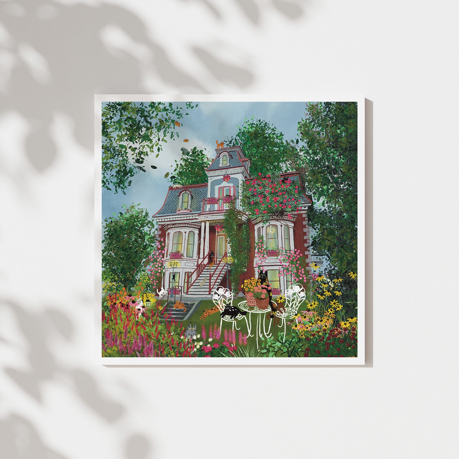 The art print of cats hanging out near a mansion in blooms is printed on high quality fine art paper.