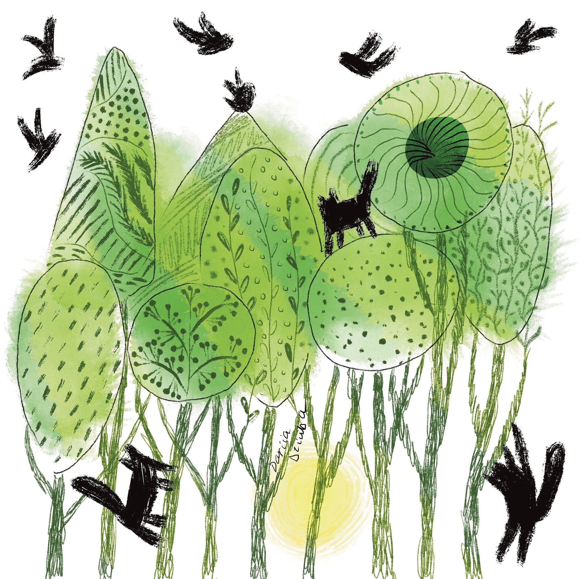 The art print of abstract cats on patterned green trees is printed on high quality fine art paper.