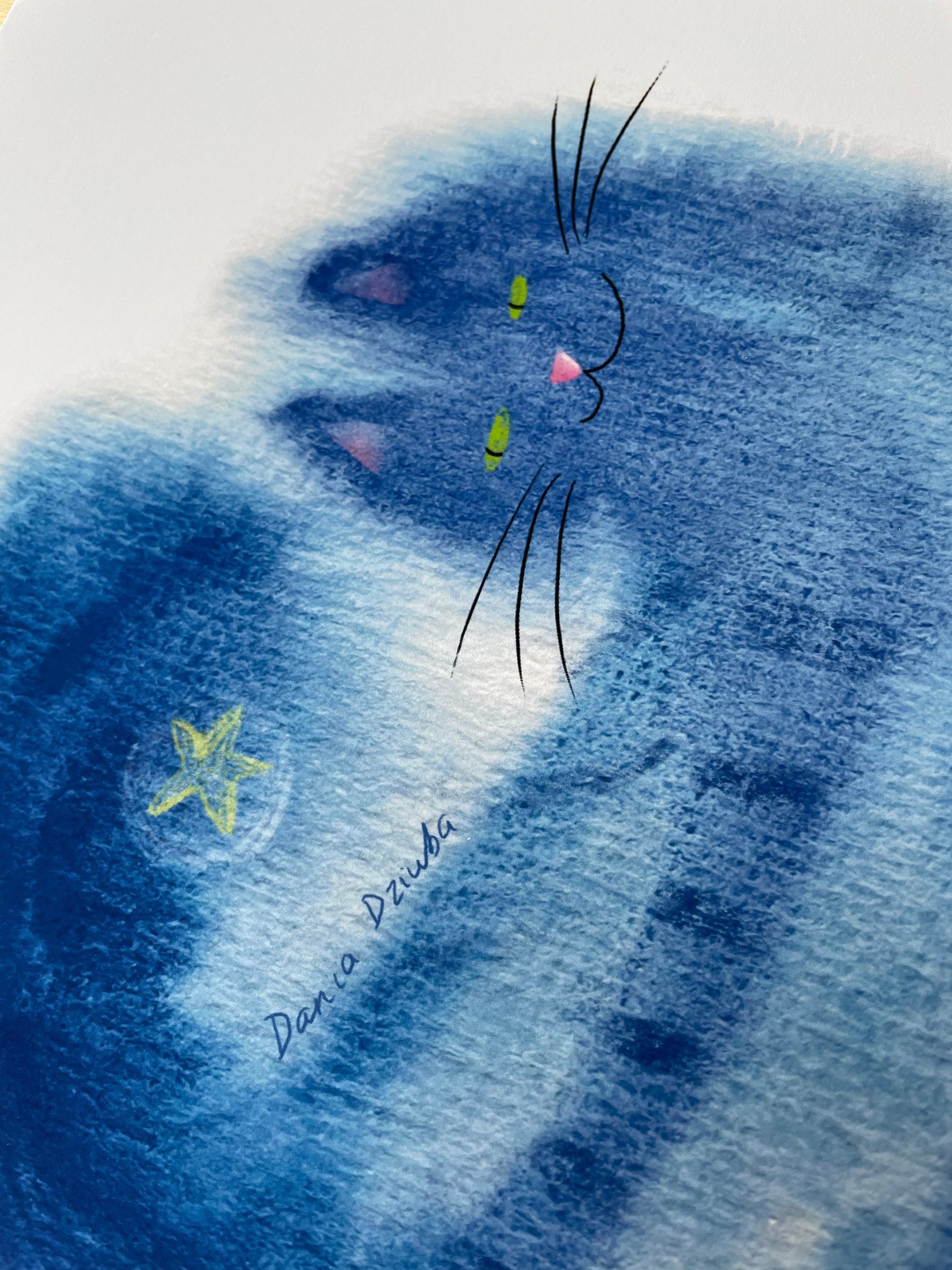 The art print of a smiling blue cat and a star is printed on high quality fine art paper.