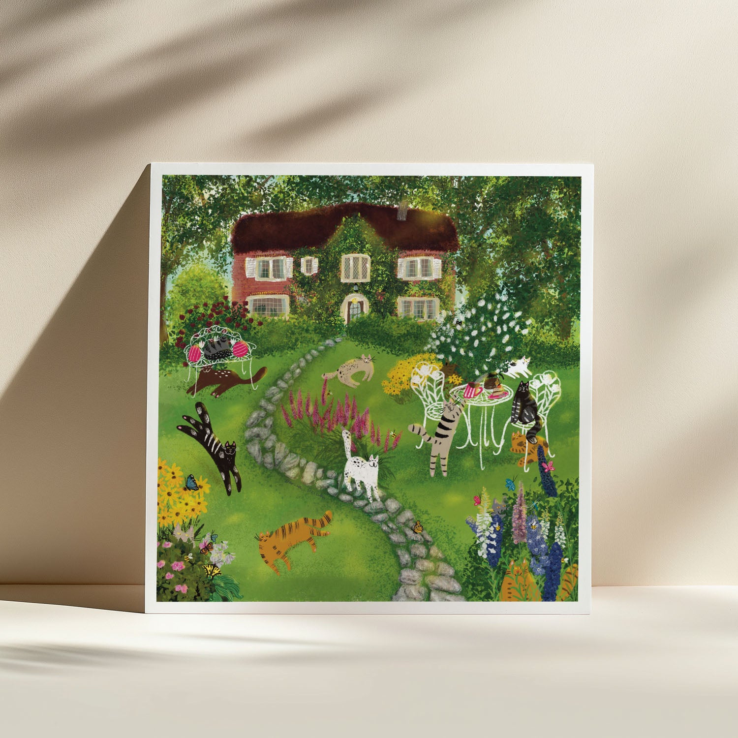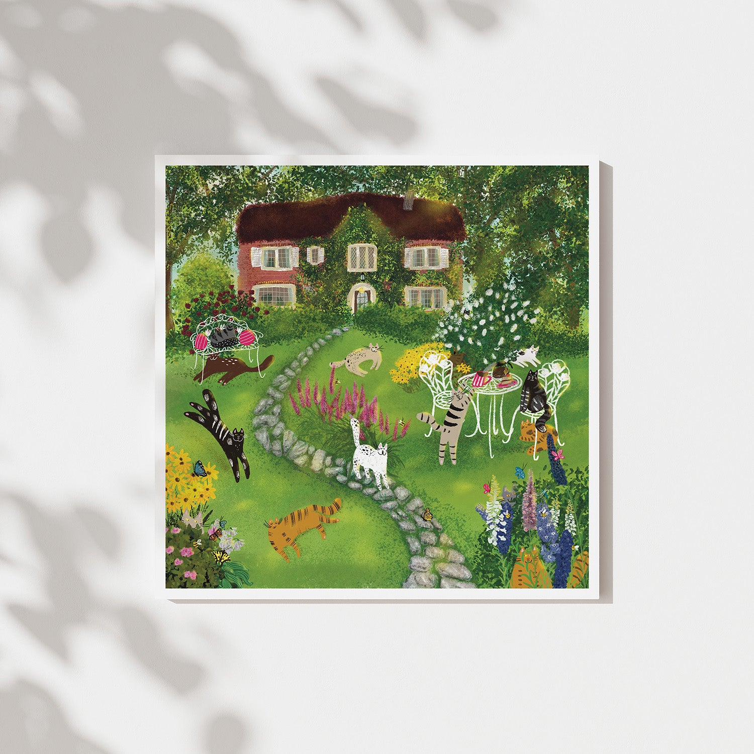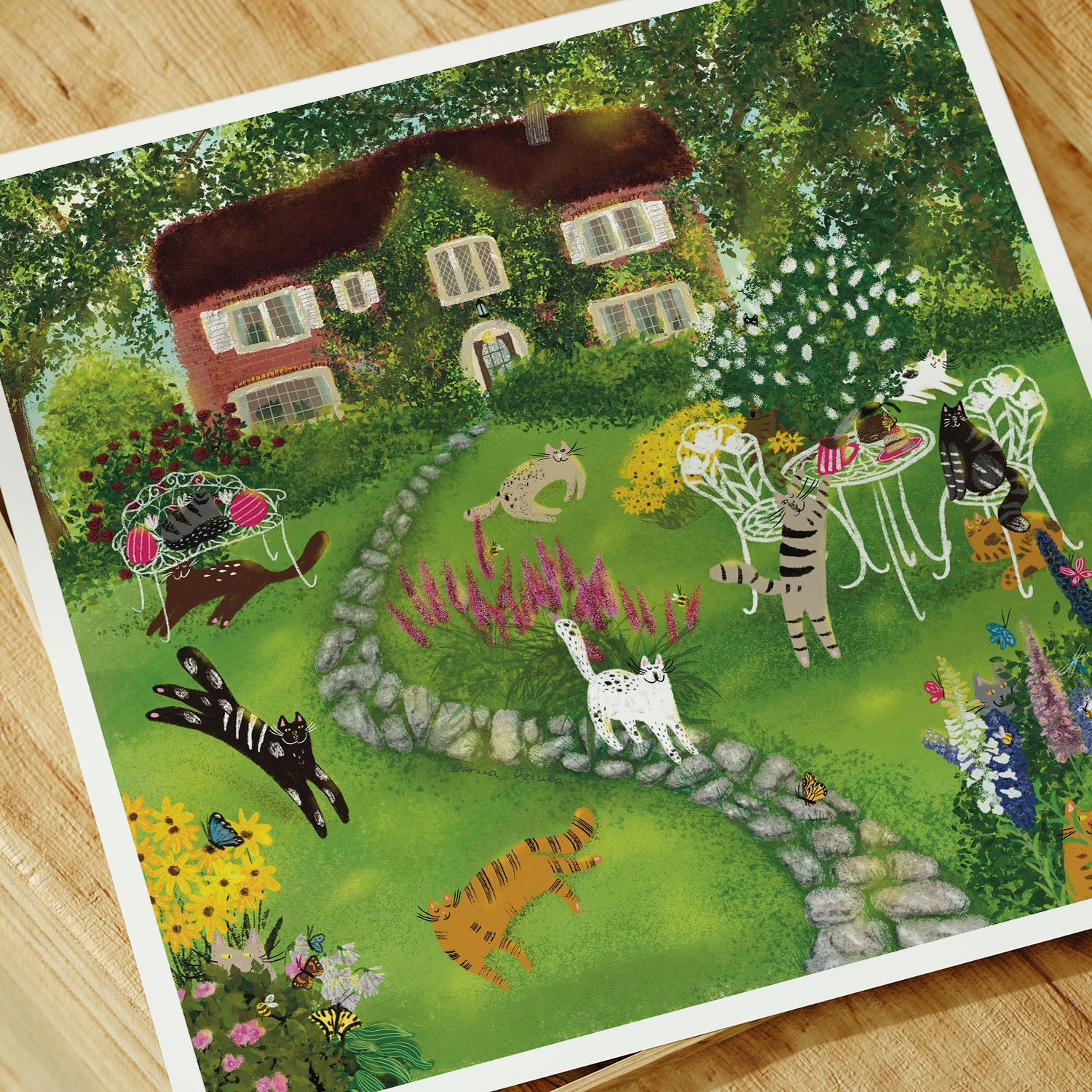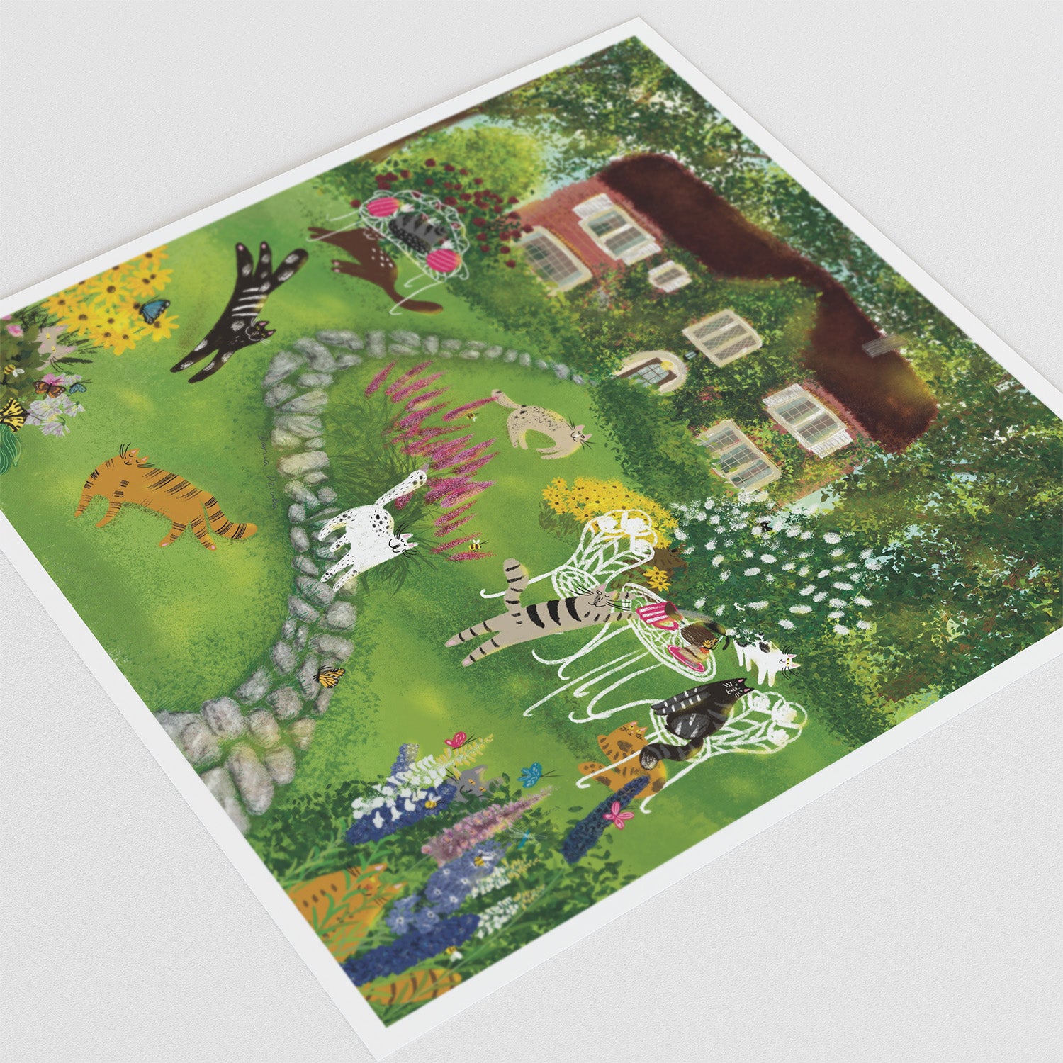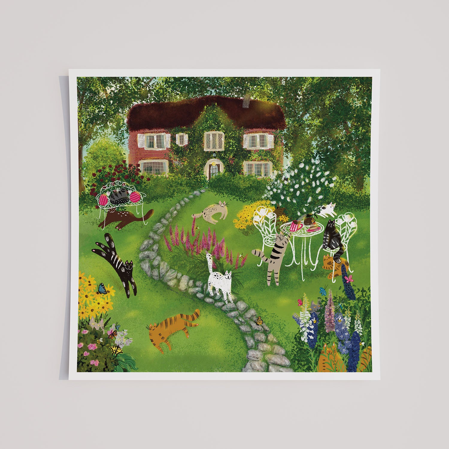 The art print of cats in front yard/garden before a house with flowers, trees, bees, butterflies illustration artwork is printed on high quality fine art paper.