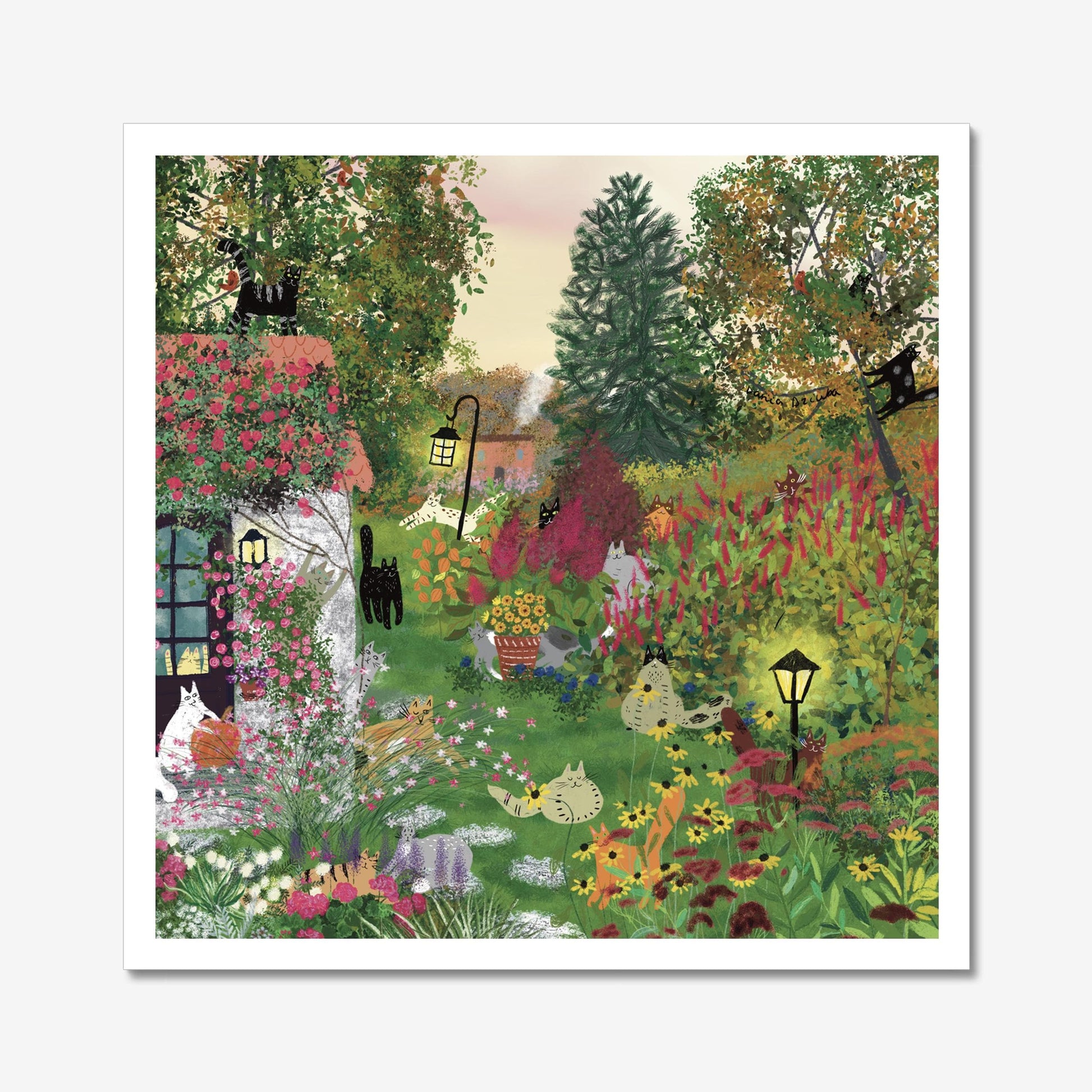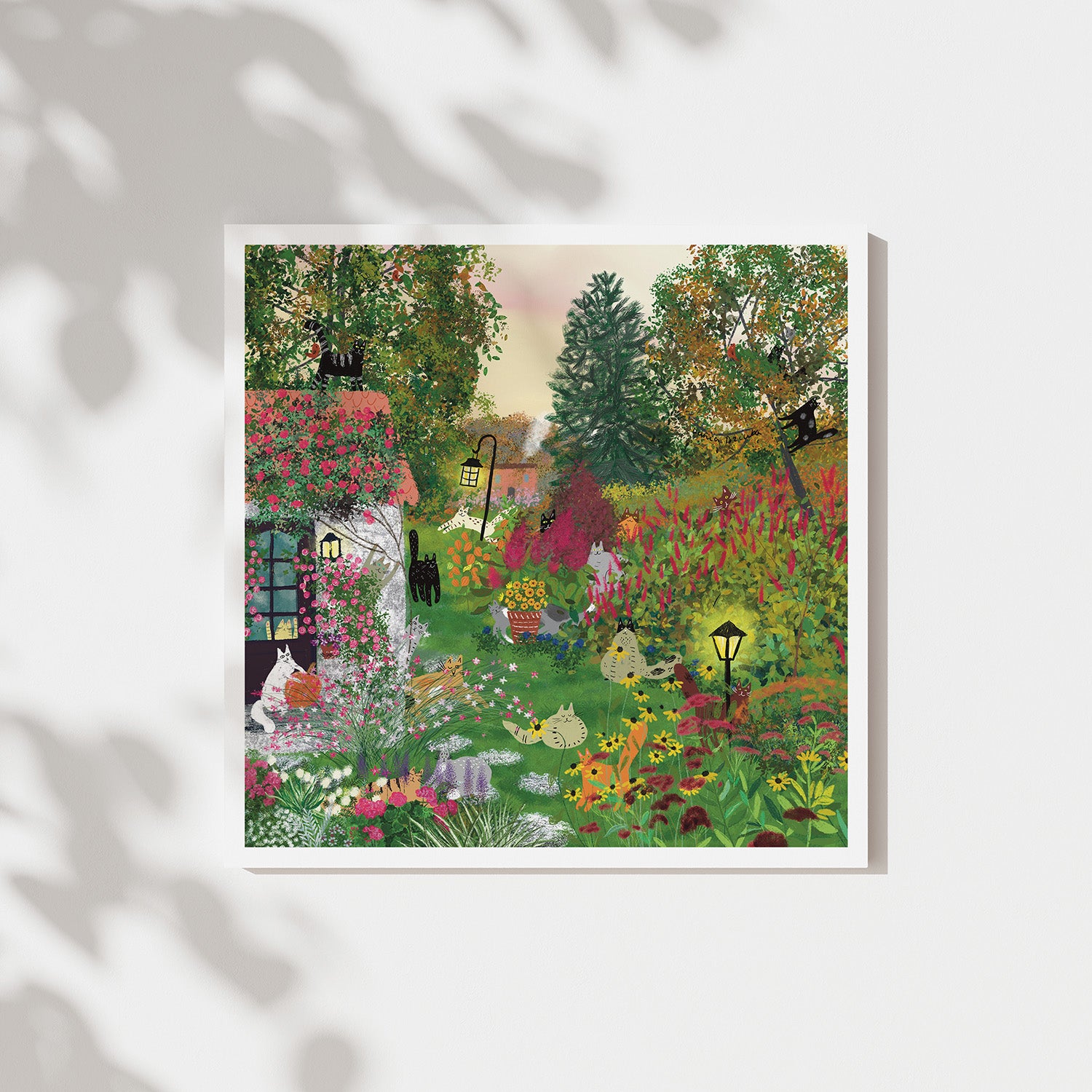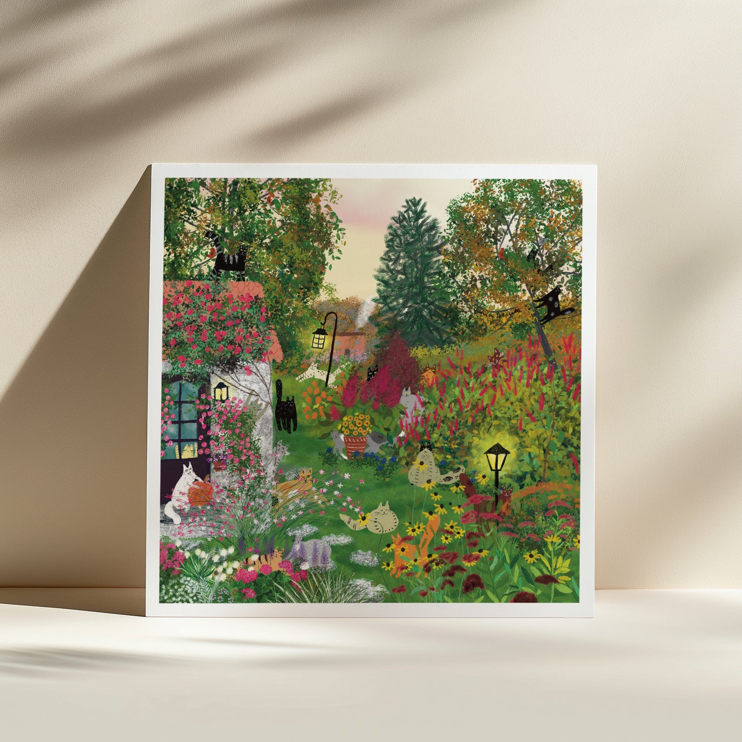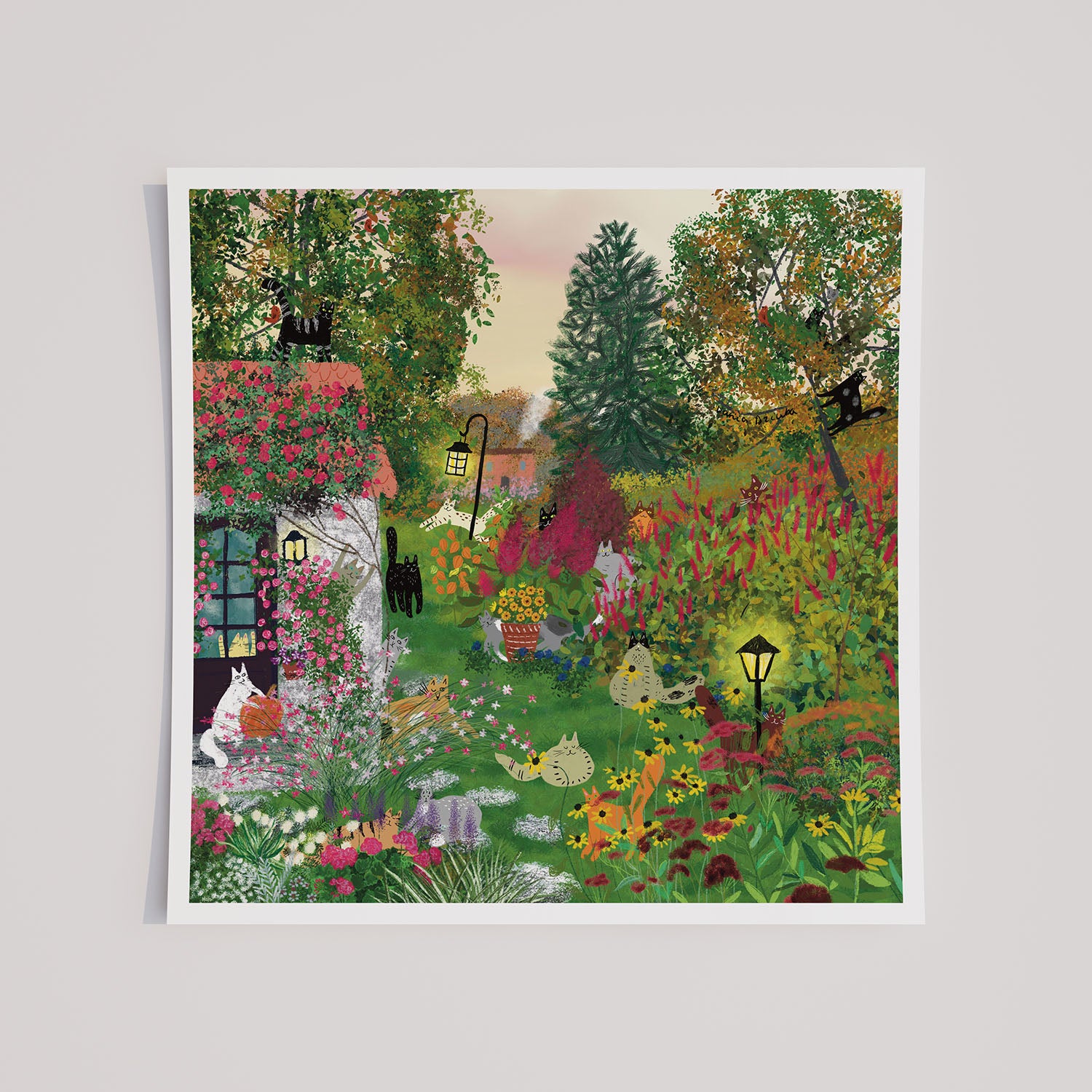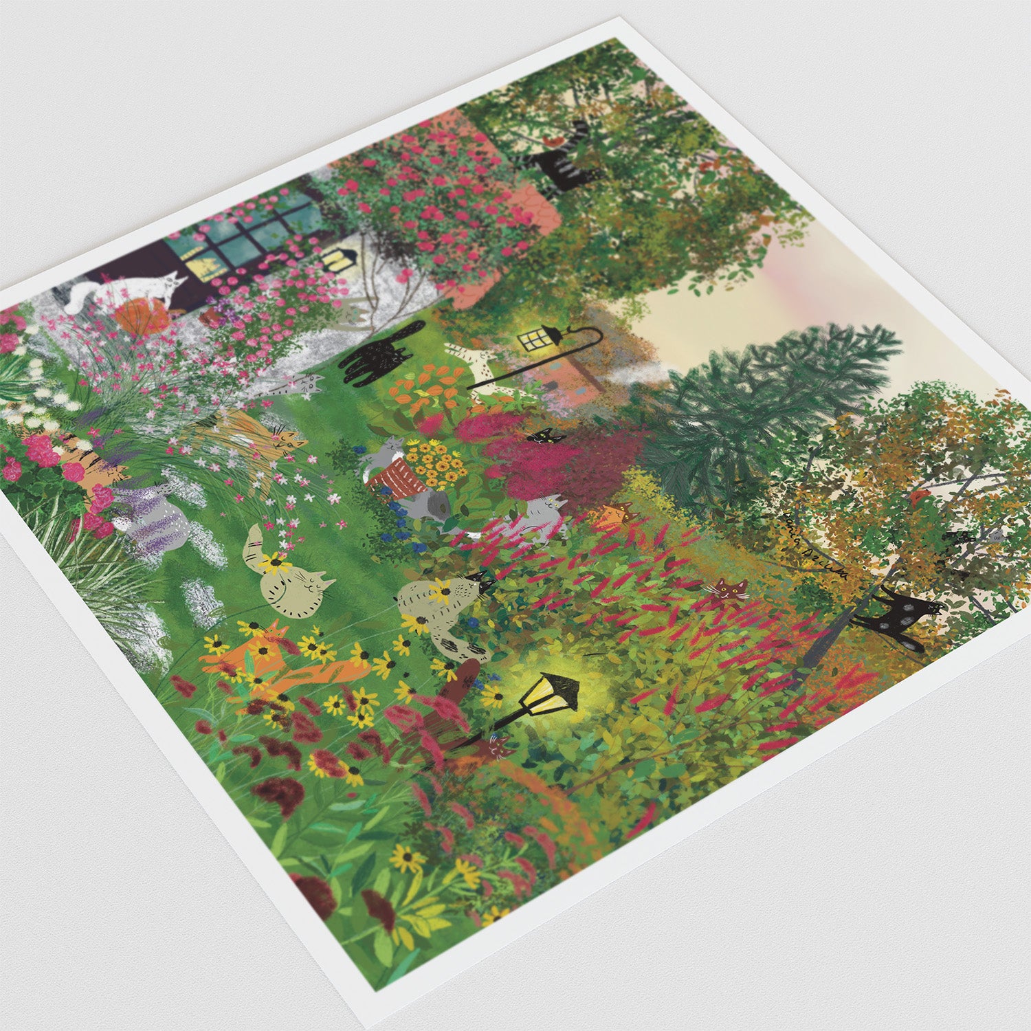 Cats in a Fall Garden at Sunset Unframed Art Print