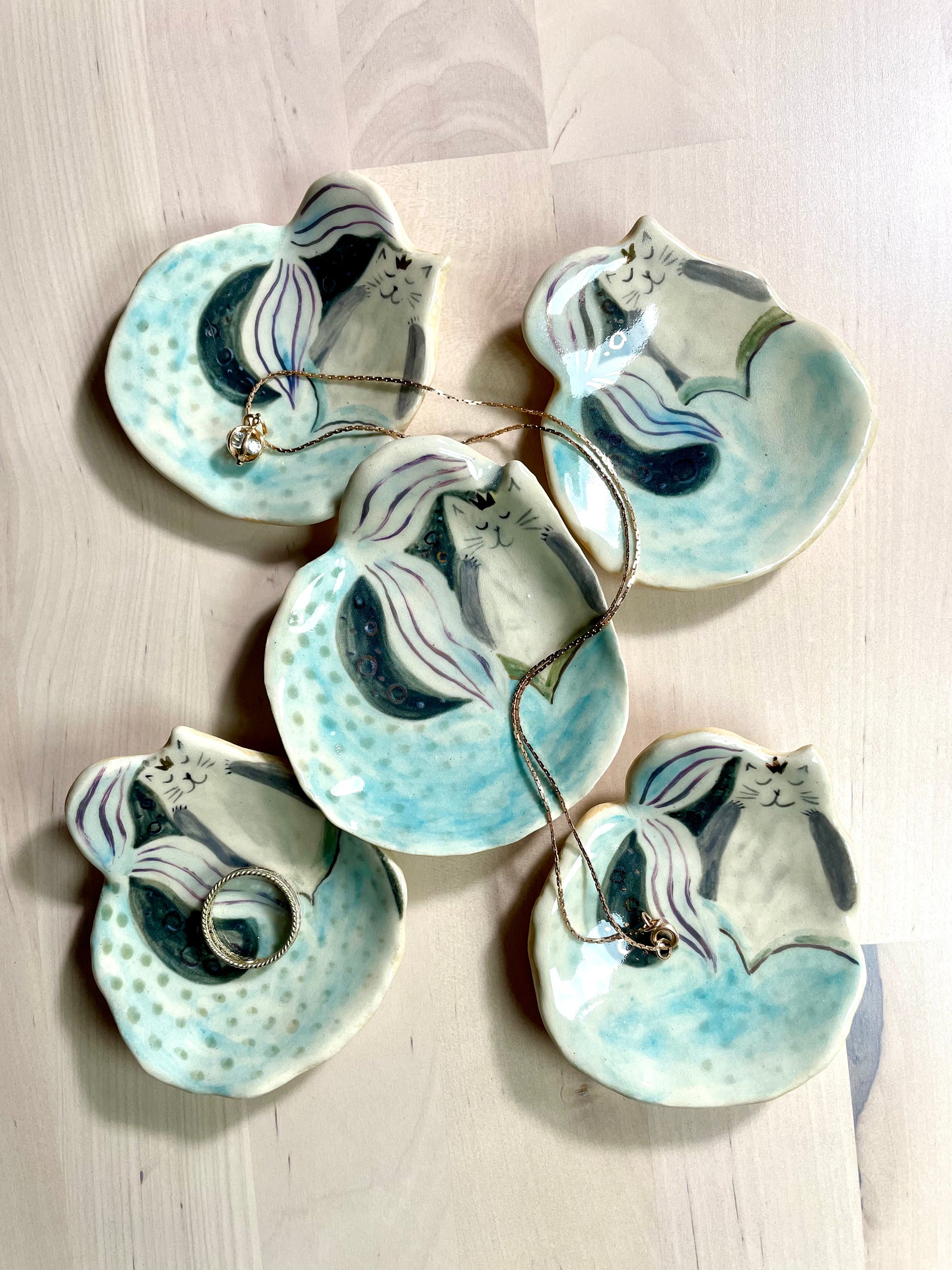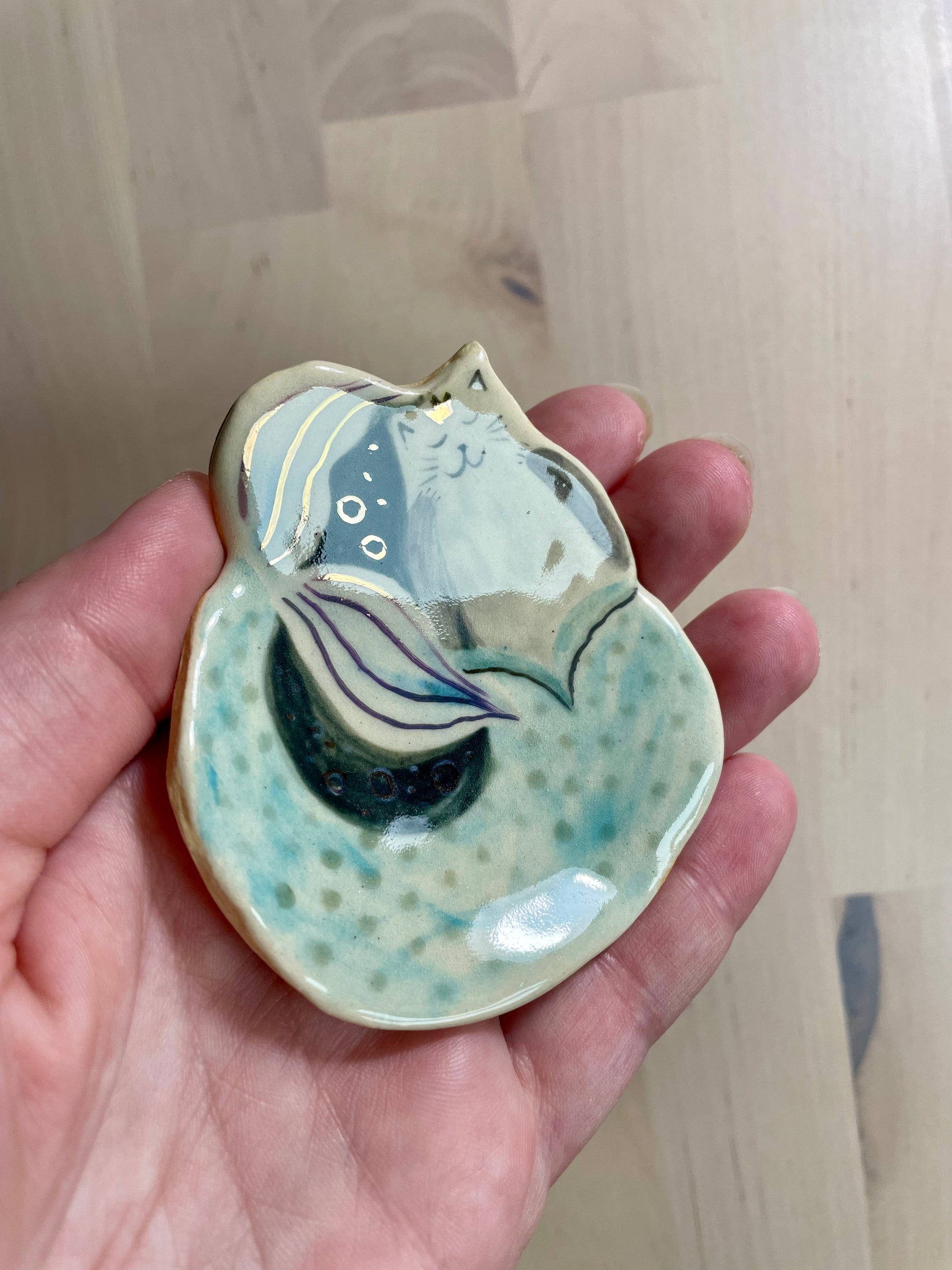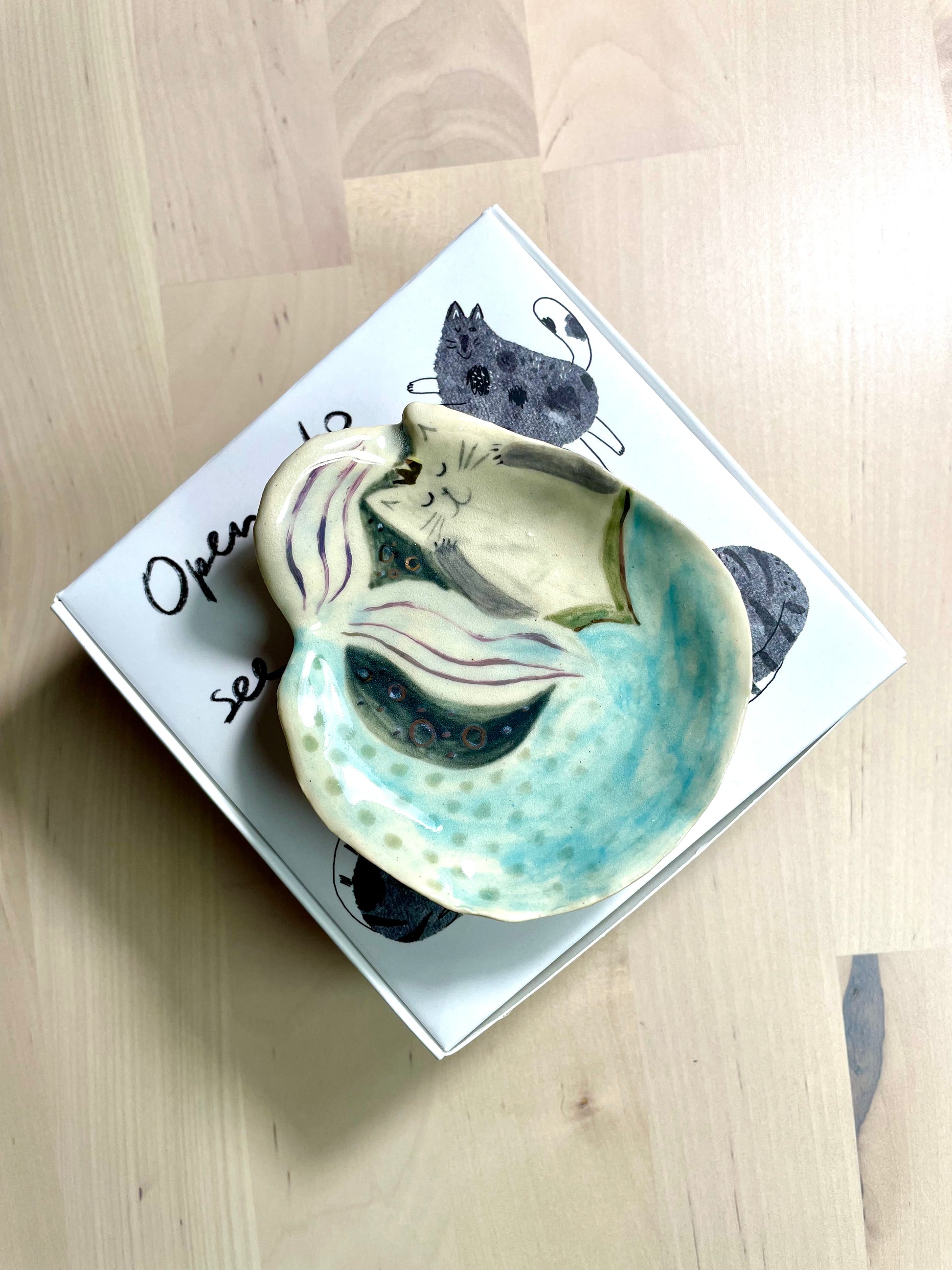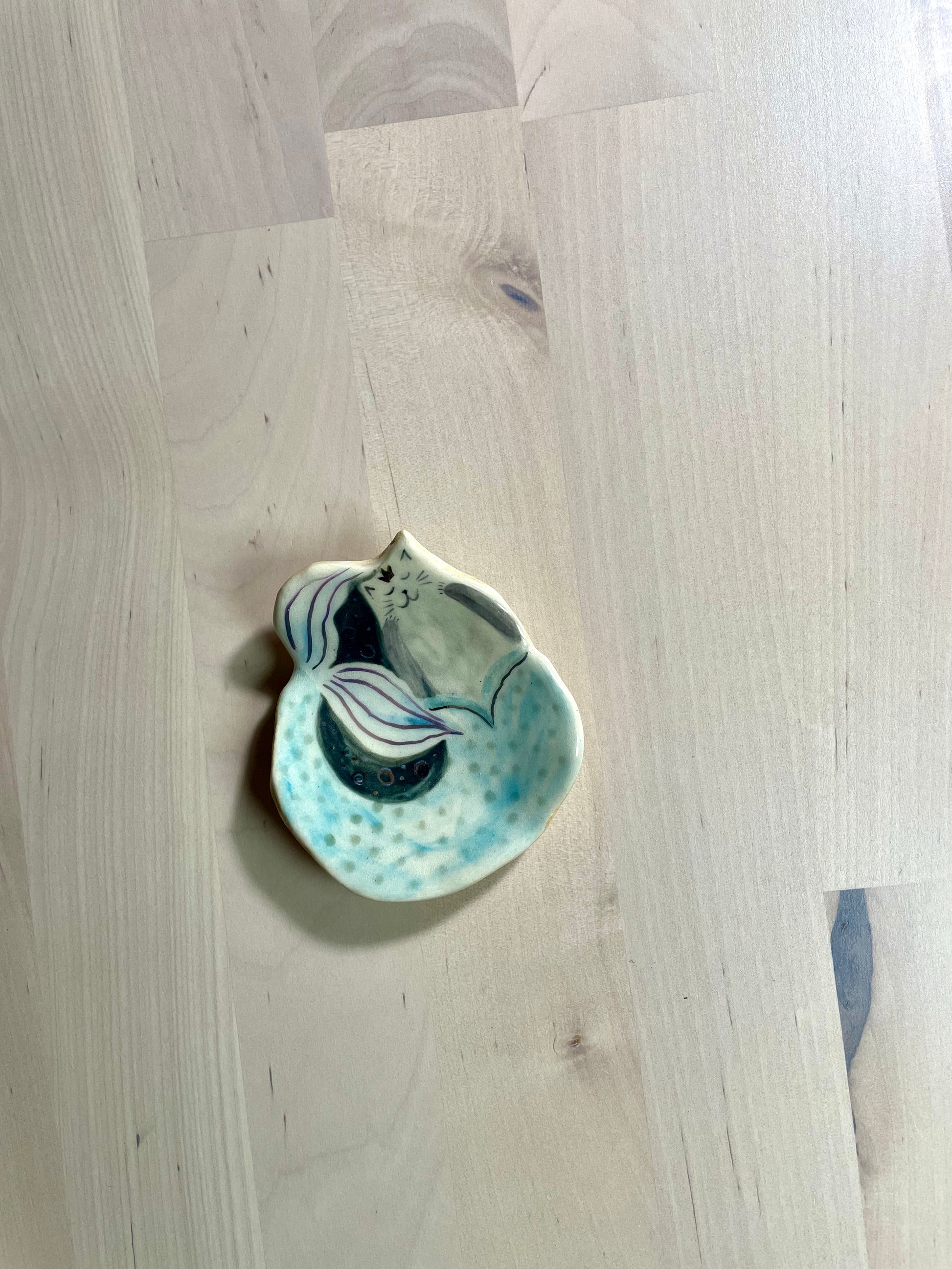 Introducing our ceramic Cat Mermaid Trinket and Tea Bag Dish, the purr-fect addition to your home decor. Made of high-quality clay materials, this dish features a charming cat mermaid design that adds a touch of whimsy to any space. Use it to organize your jewelry or as a tea bag holder, the possibilities are endless.