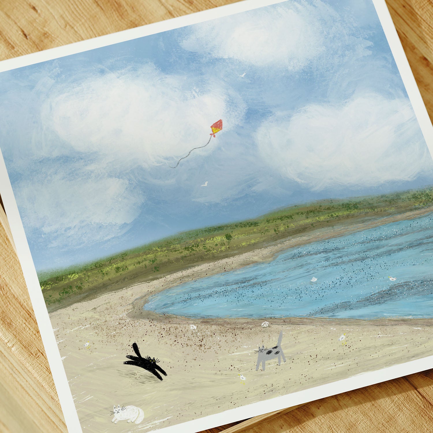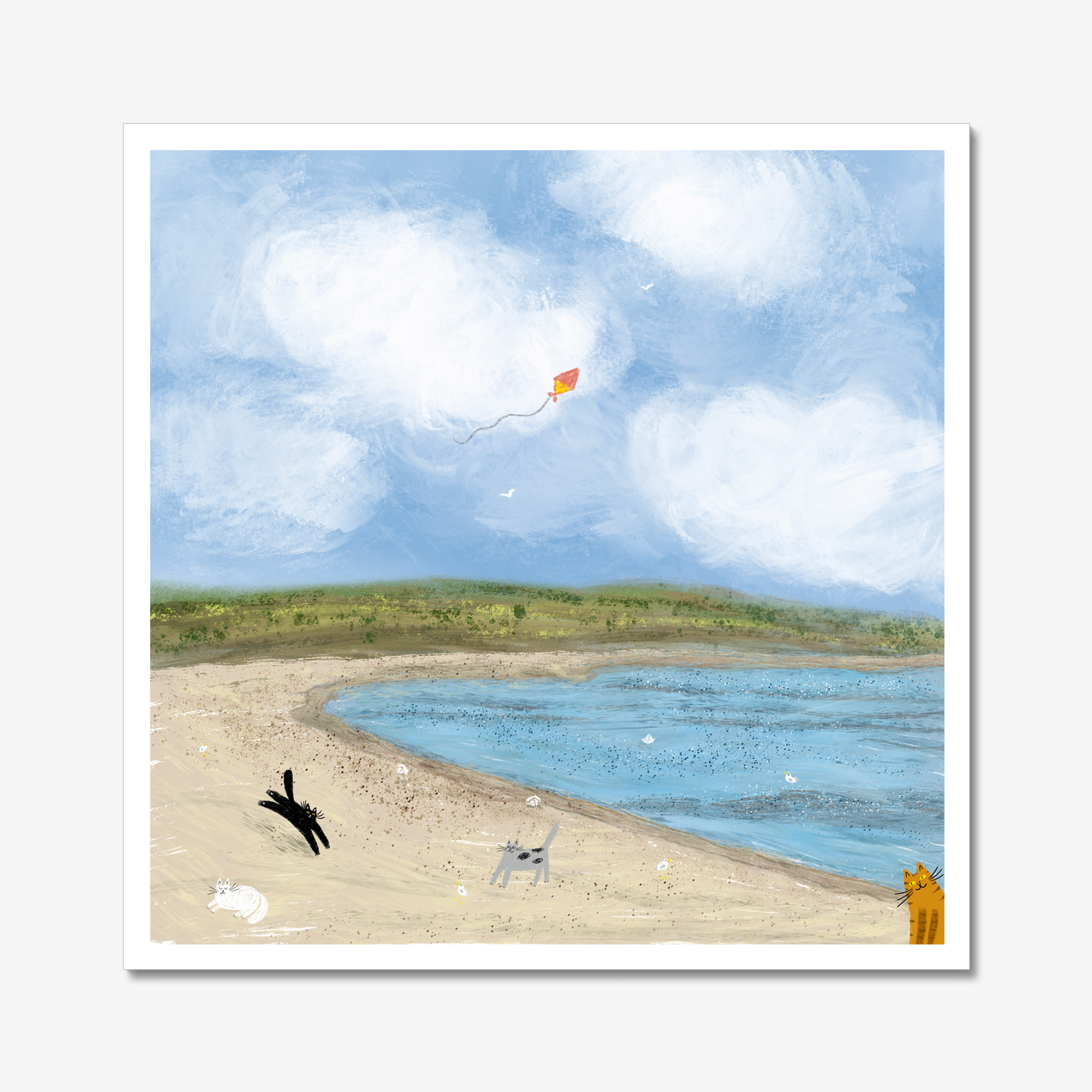 The unframed art print of cats flying a kite at a beach is printed on high quality fine art paper.