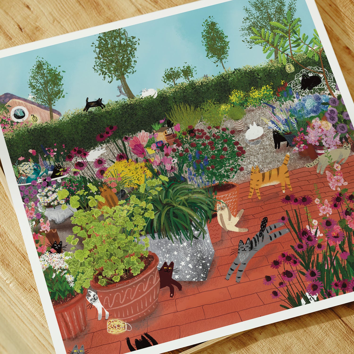 The art print of cats at a container garden is printed on high quality fine art paper.