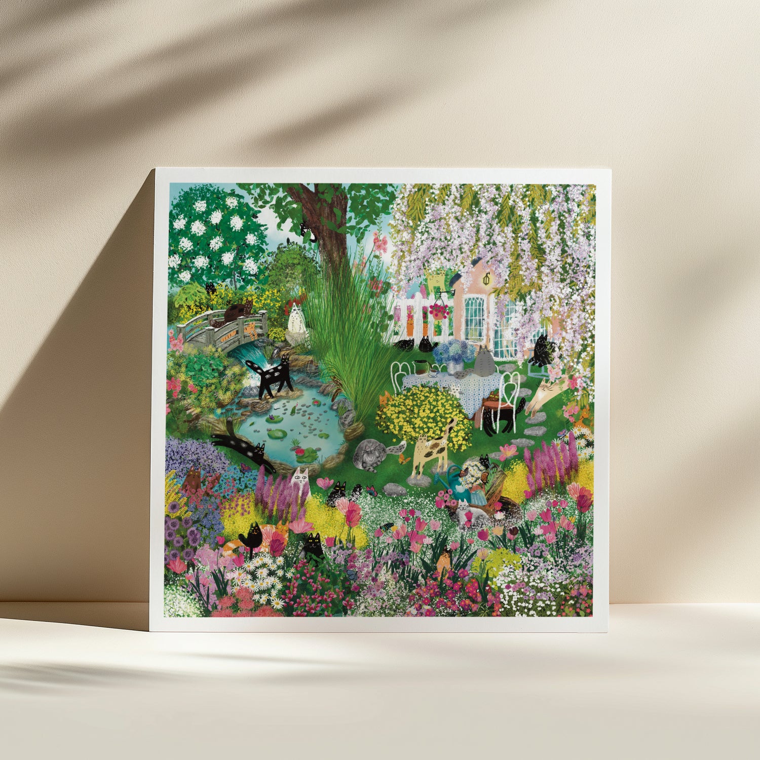 Step into a whimsical feline paradise with this captivating cat art print based on a photo I took at Disney Paris. Awash in vibrant colours, this illustration depicts a picturesque garden awash with the delicate blooms of flowers. Cats can be seen exploring their surroundings, frolicking amongst the fragrant petals and basking in the warm sunlight that filters through the canopy of trees. A tranquil pond adds a touch of serenity to the scene, complete with a charming wooden bridge that invites wandering paws to traverse its path.