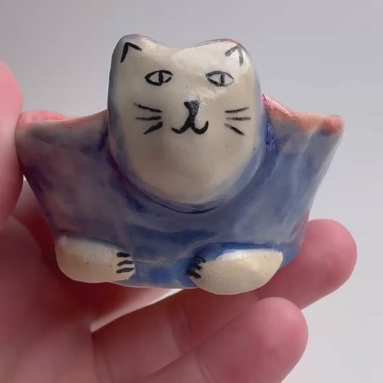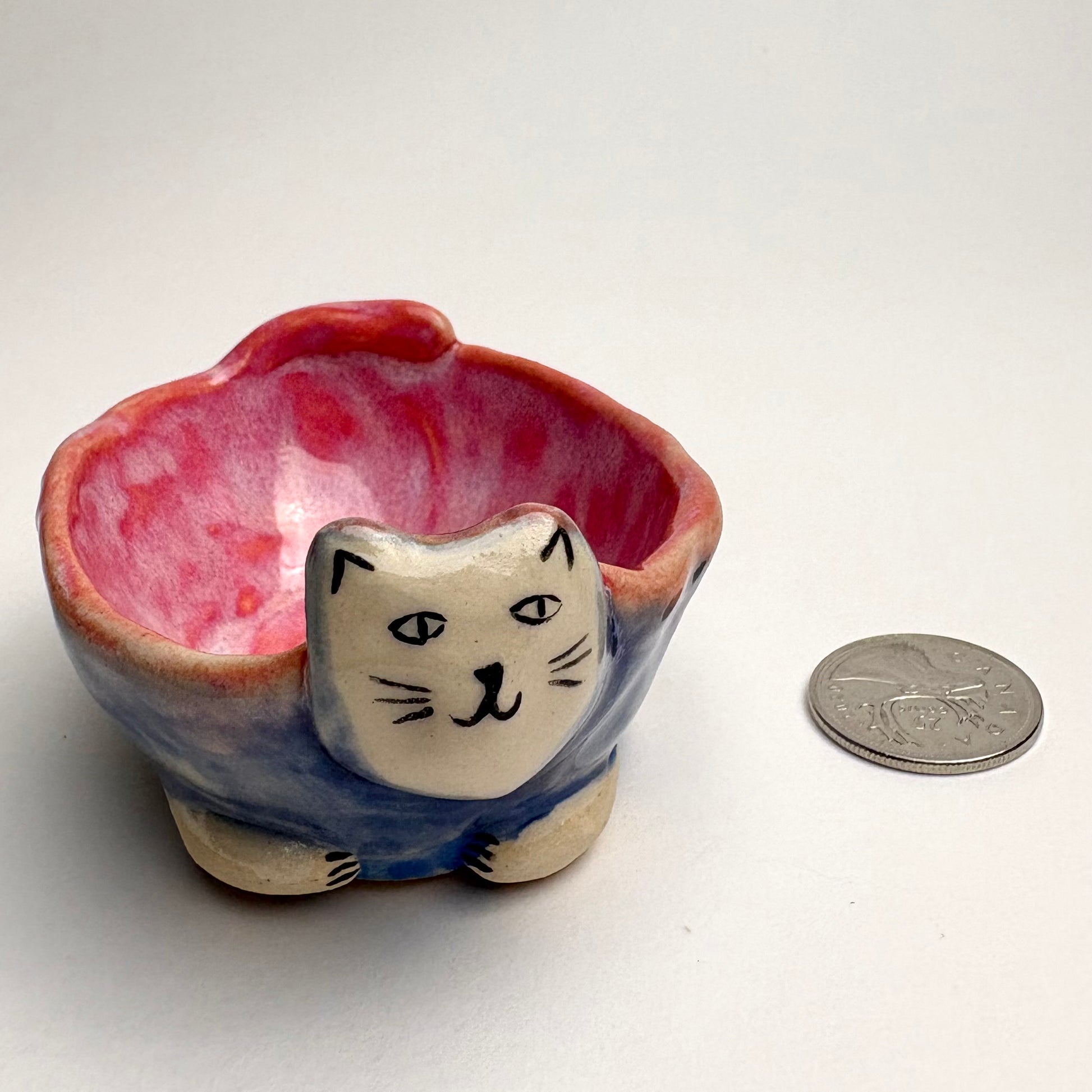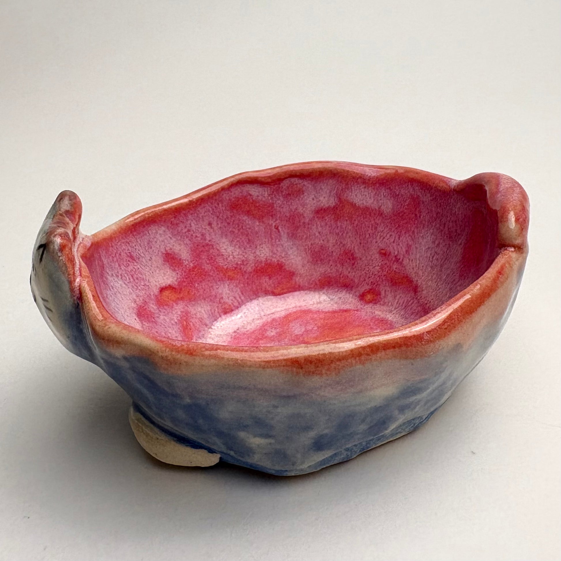 This tiny cat dish is hand-sculpted from white clay and glazed in soft pink and blue tones. The little kitty face on the front gives it a sweet, slightly quirky personality, and the organic shape shows off its handmade nature. Each one comes out a bit different, which is part of the charm.
