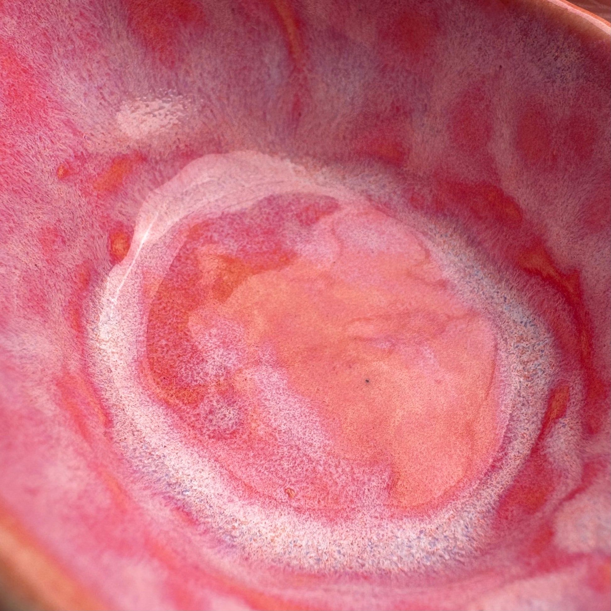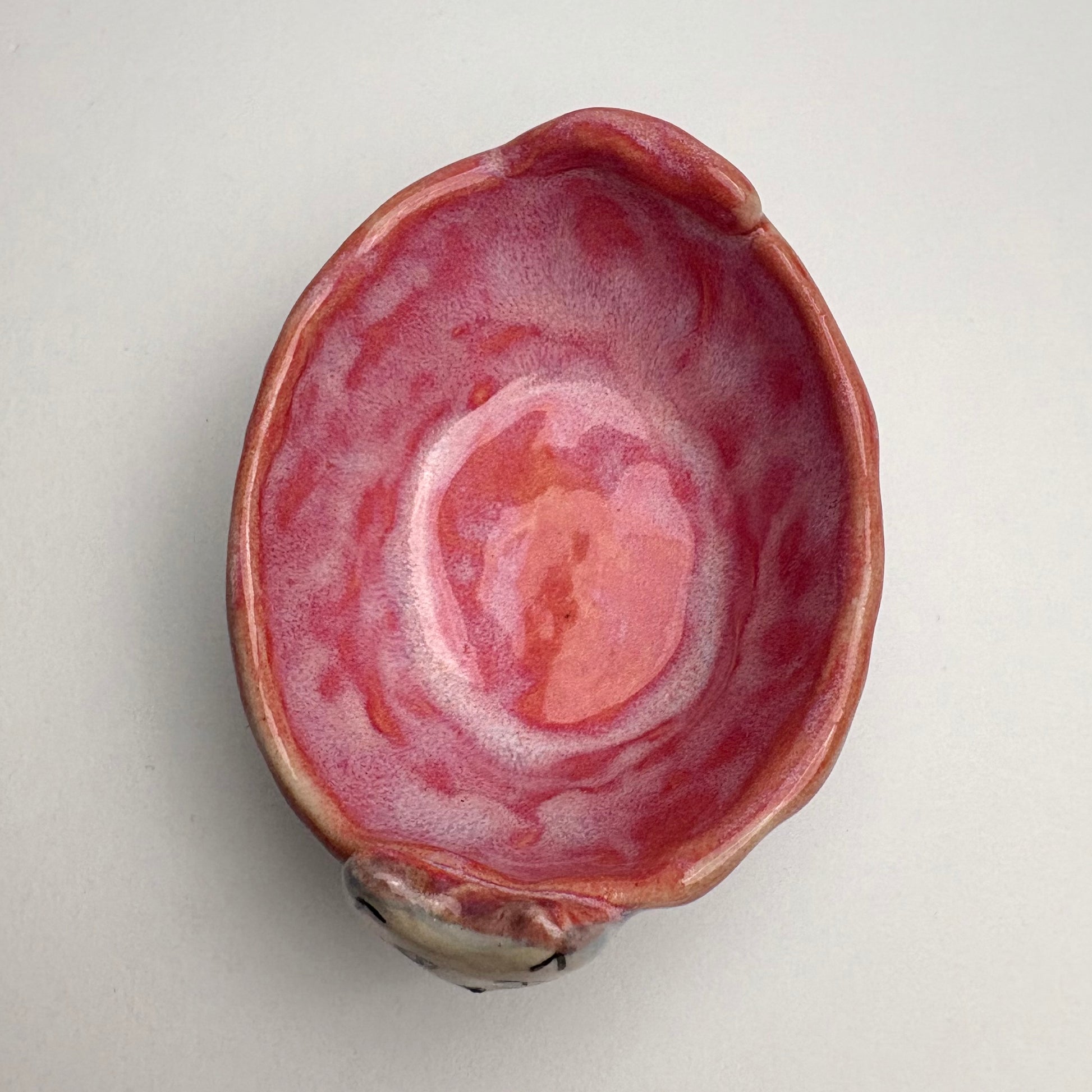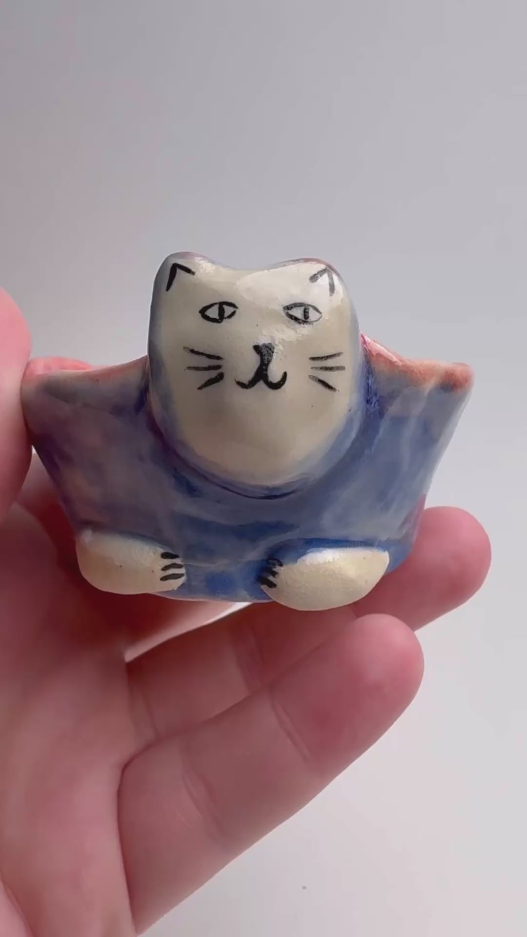 This tiny cat dish is hand-sculpted from white clay and glazed in soft pink and blue tones. The little kitty face on the front gives it a sweet, slightly quirky personality, and the organic shape shows off its handmade nature. Each one comes out a bit different, which is part of the charm.