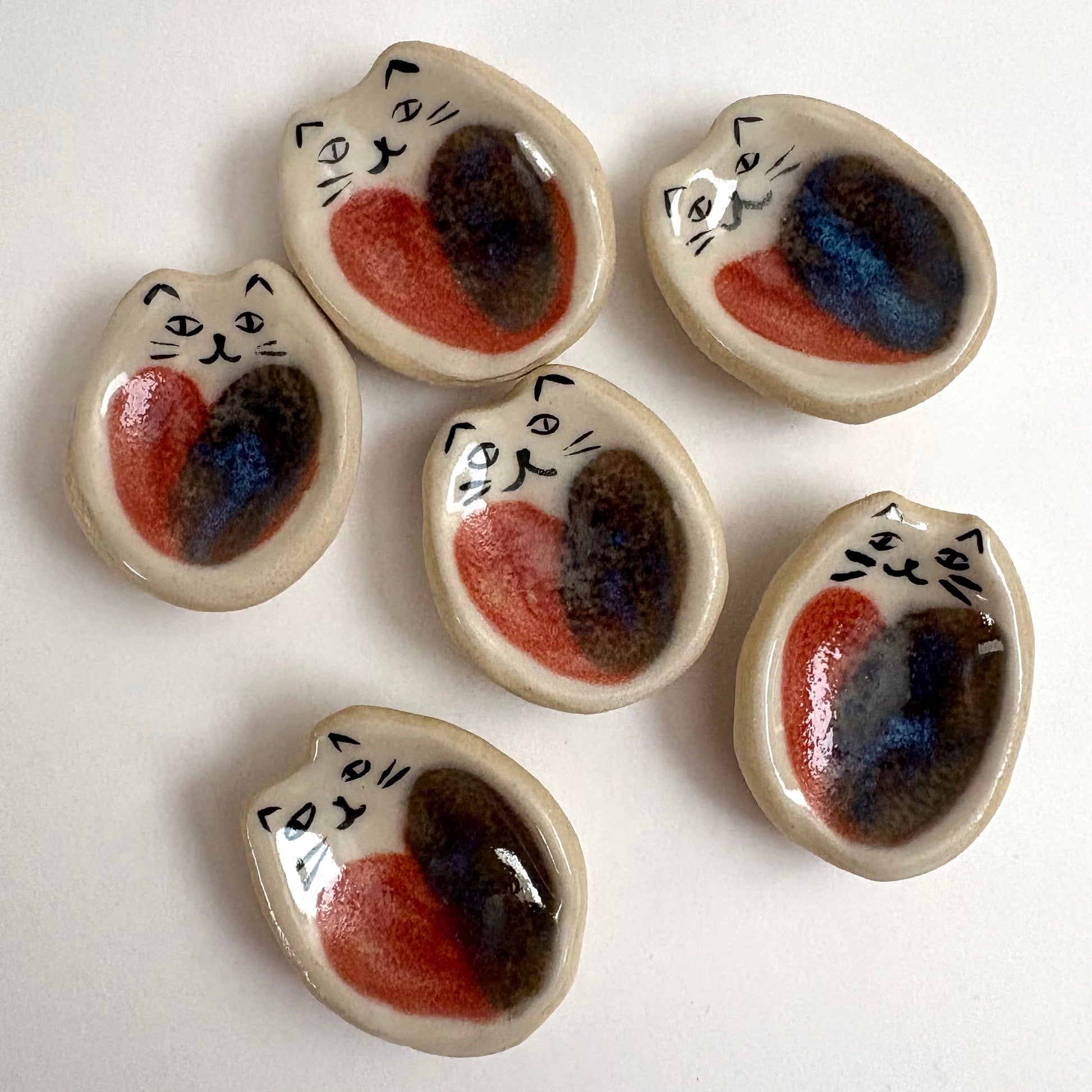 Handcrafted ceramic cat worry stone (approx. 1.75 × 1.5 in / 4.5 × 3.8 cm). Each piece features a charming hand-painted cat face and a smooth glazed surface that feels soothing in the palm. Perfect for moments of calm, focus, or simply as a delightful pocket companion.