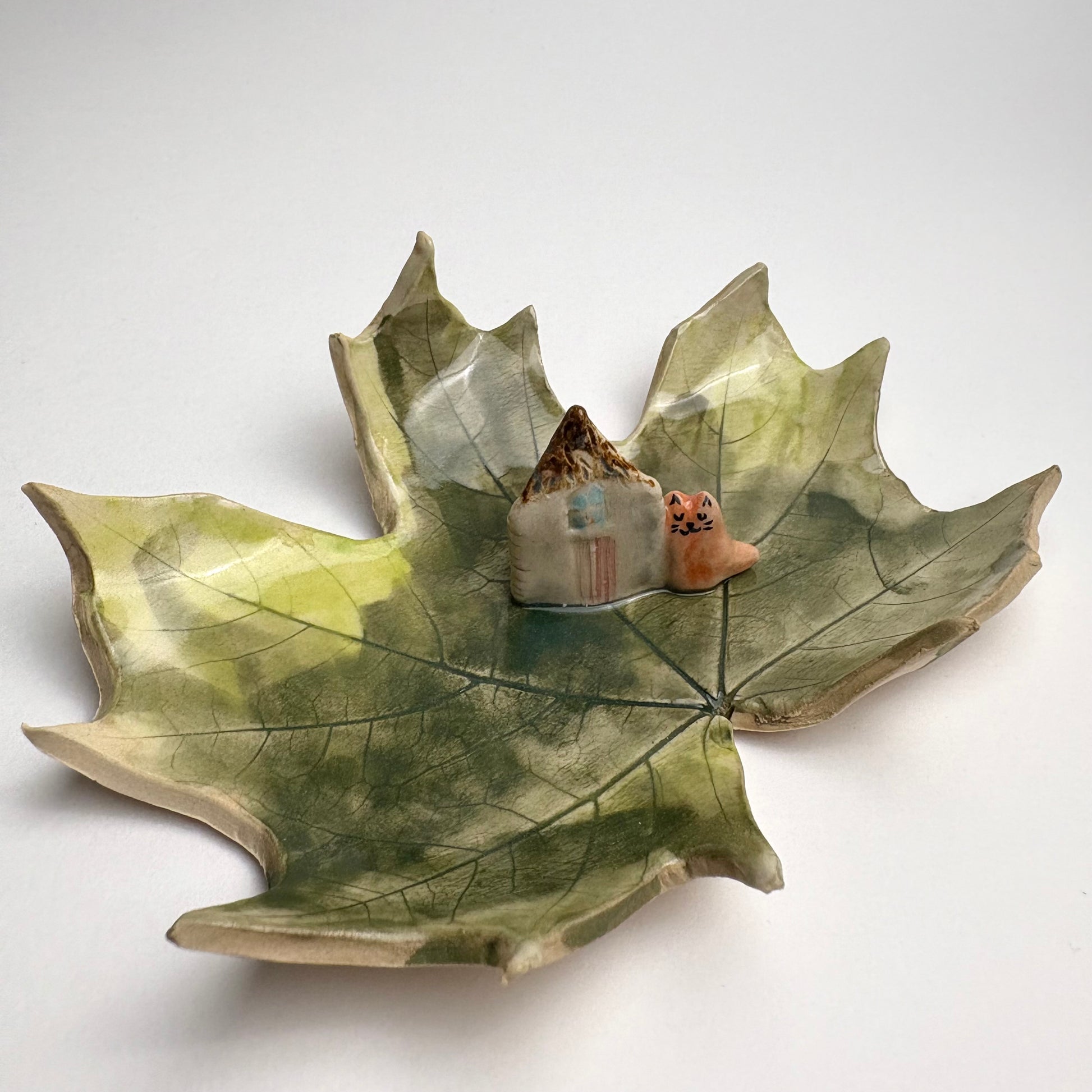 Handmade Ceramic Maple Leaf Dish with Mini House & Cat — Nature-Inspired Trinket Plate