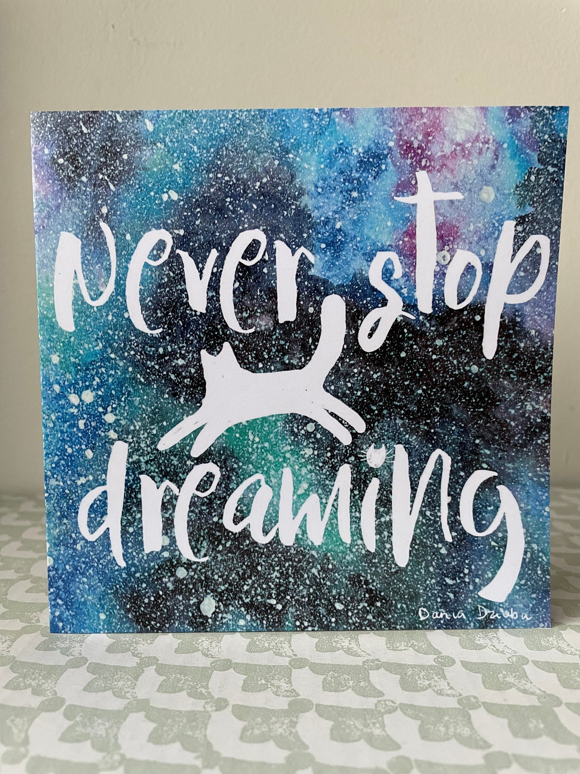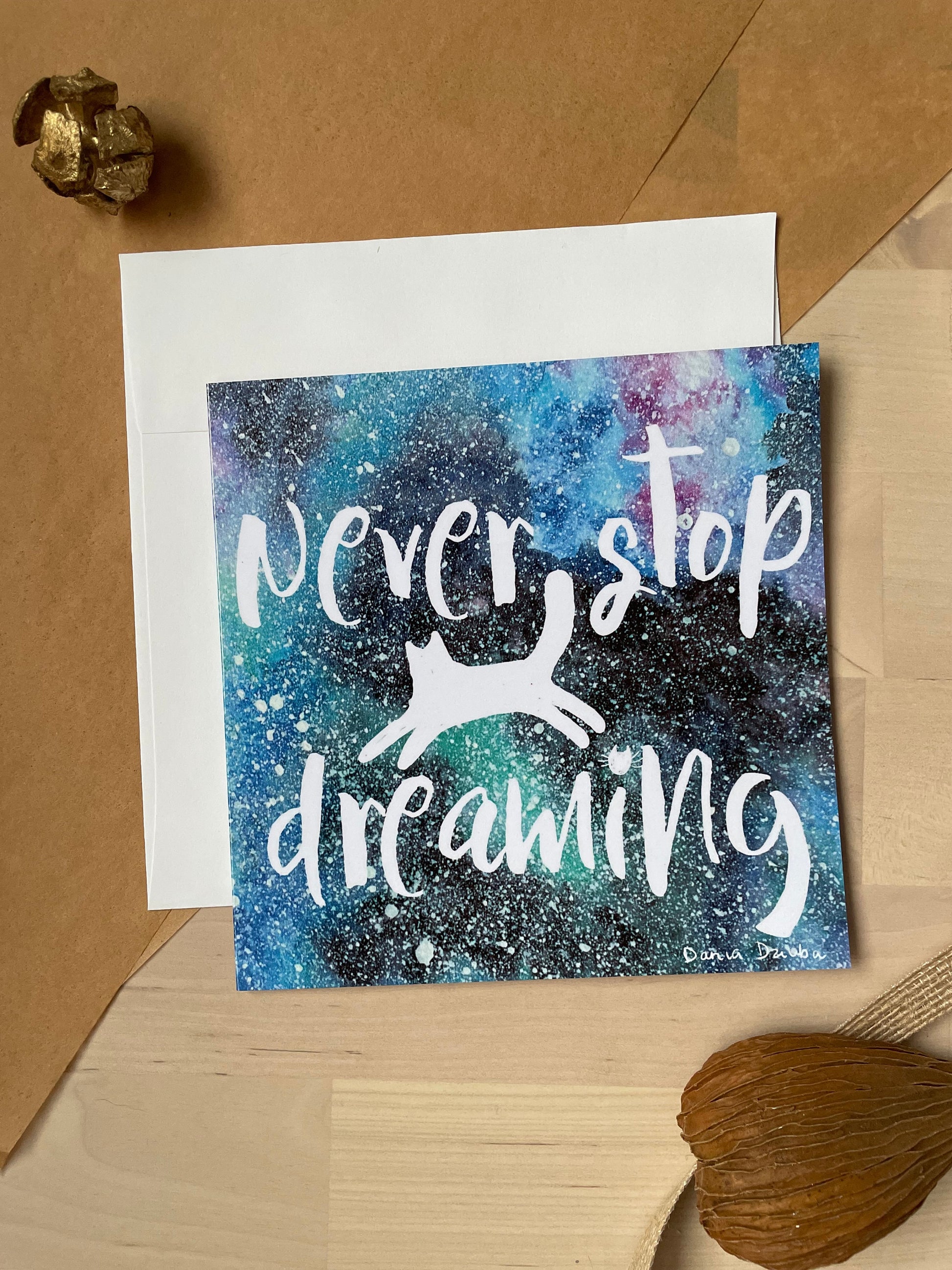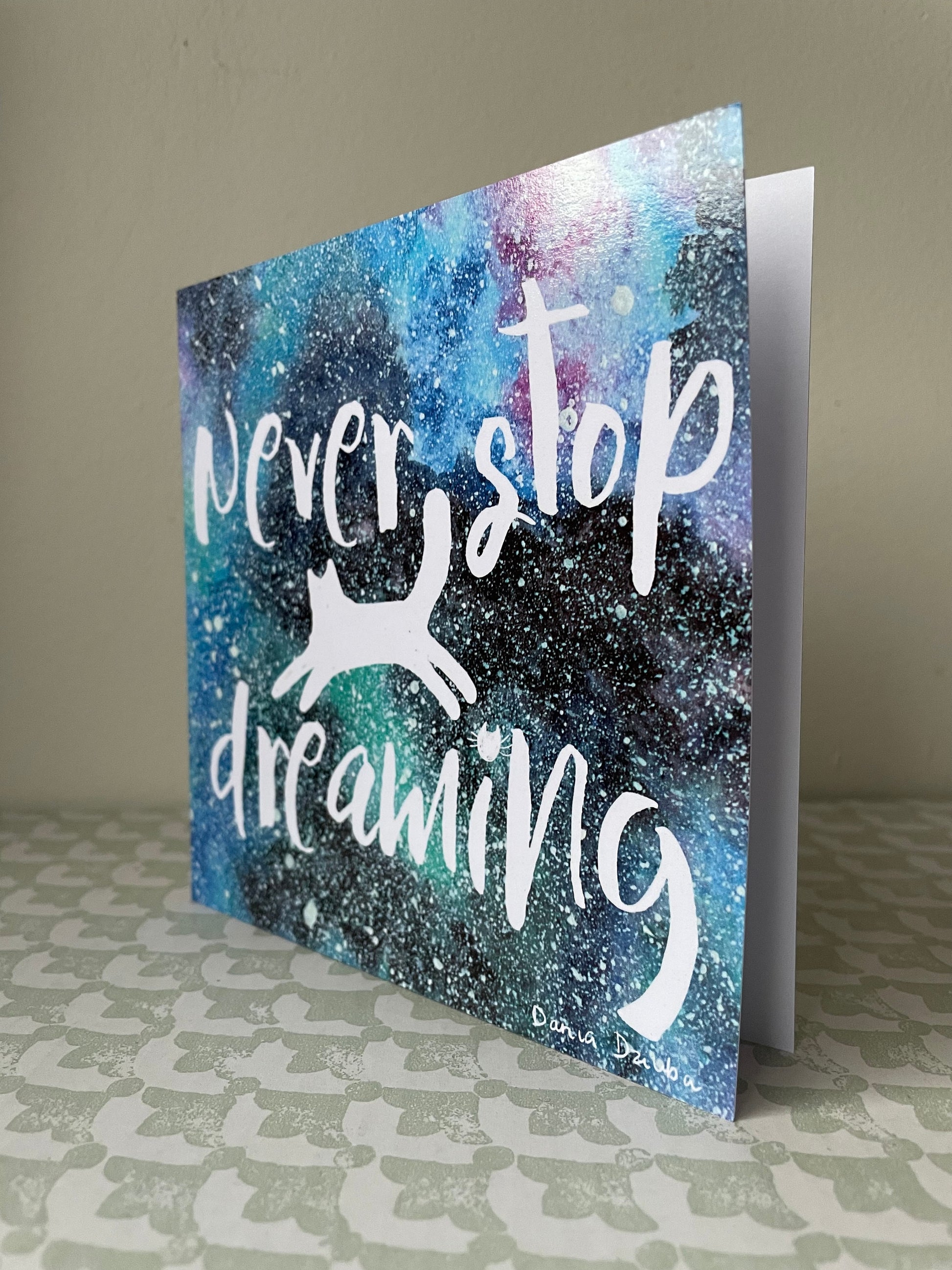 The card is printed on high density paper and measures 5"x5" (12.7x12.7cm). It is glossy on the outside and uncoated and blank inside to write your message. It comes with a fitting white envelope.