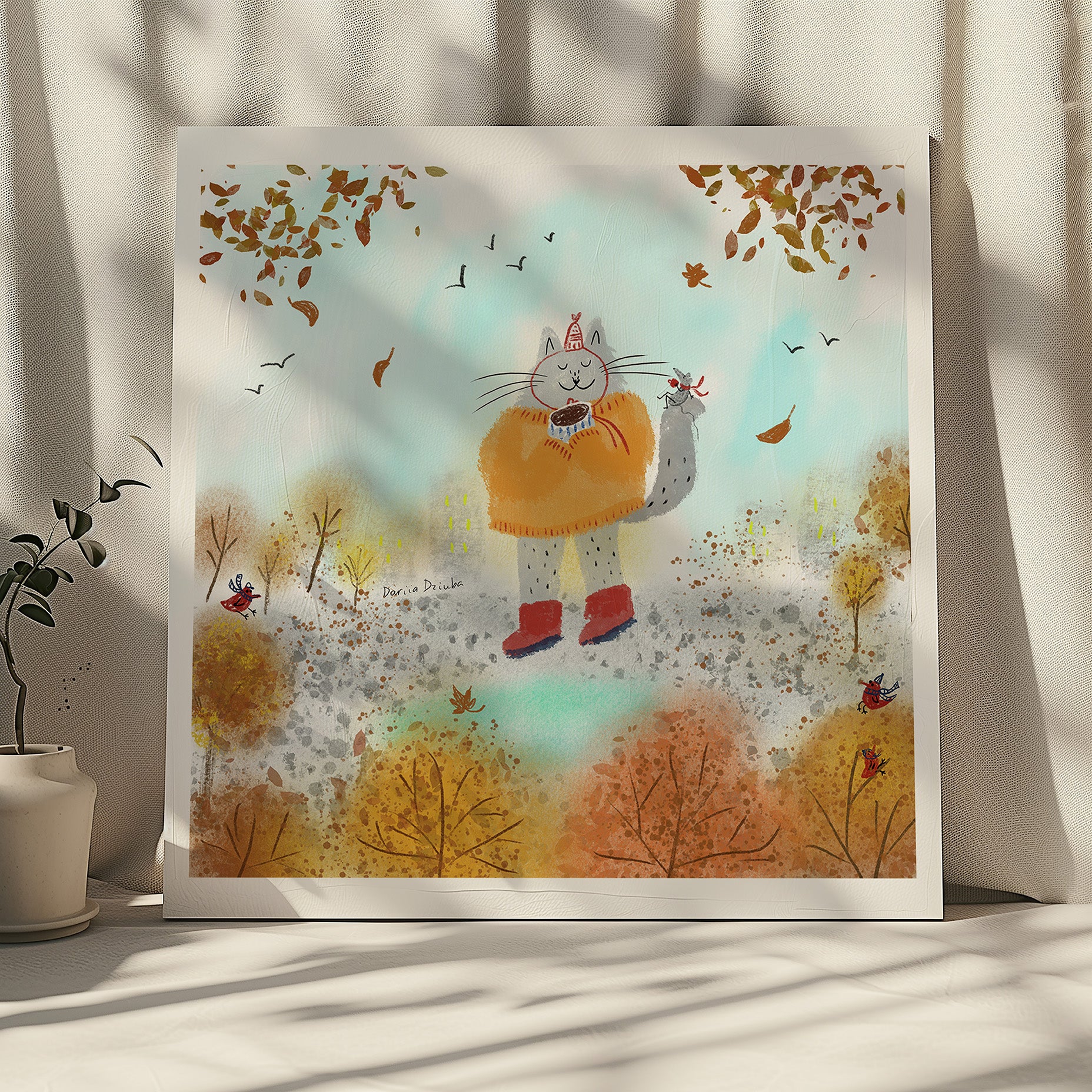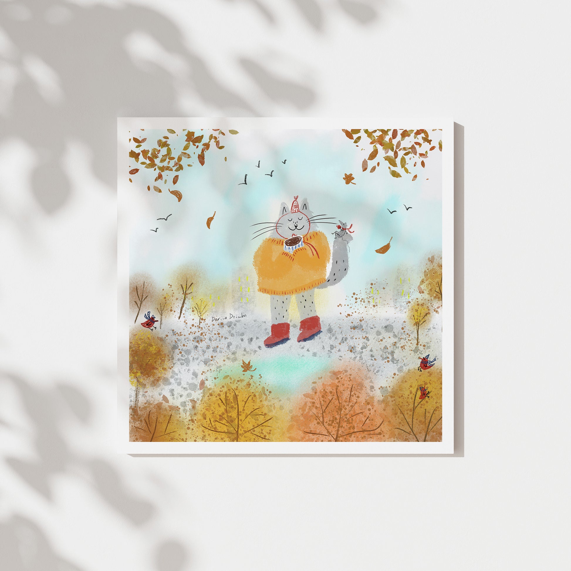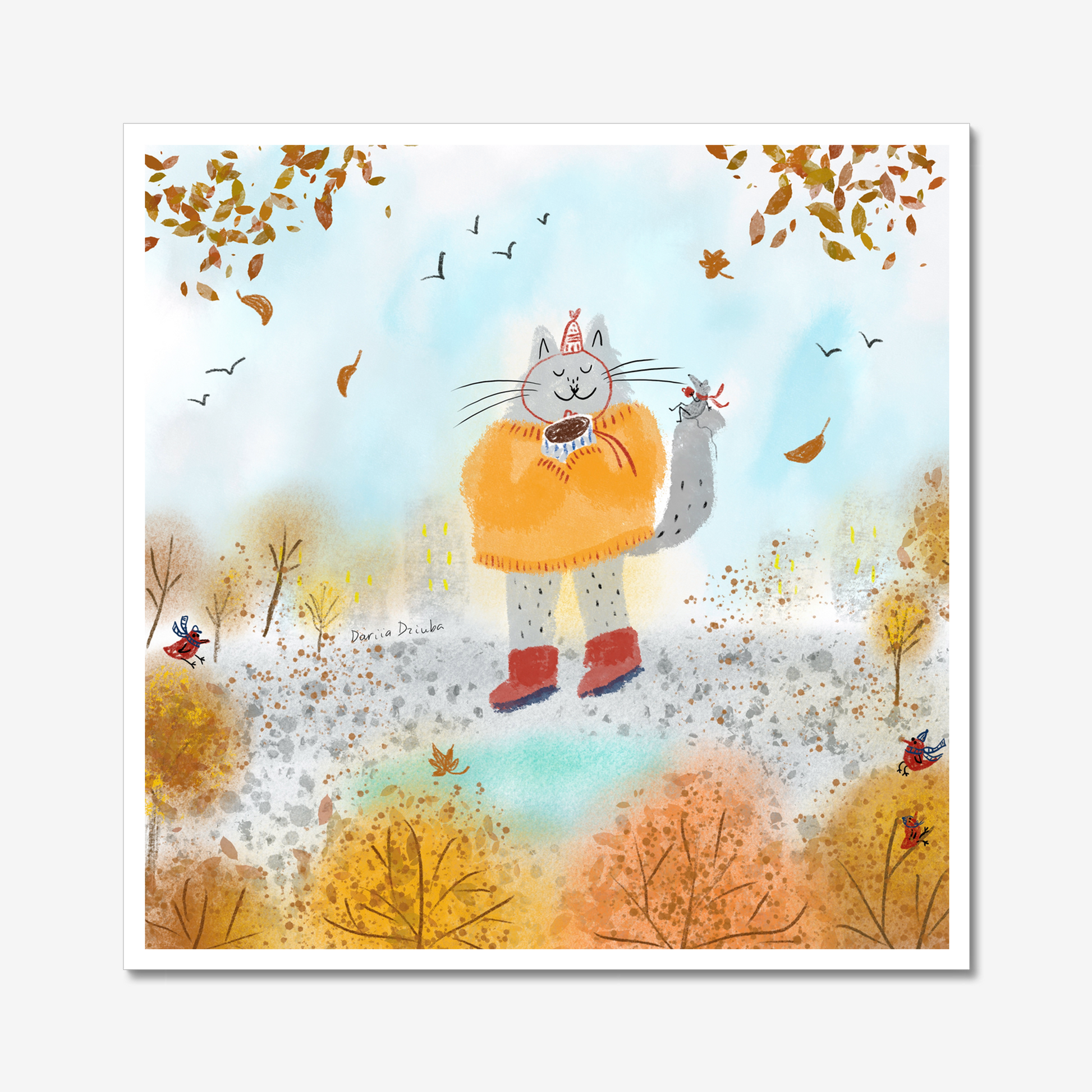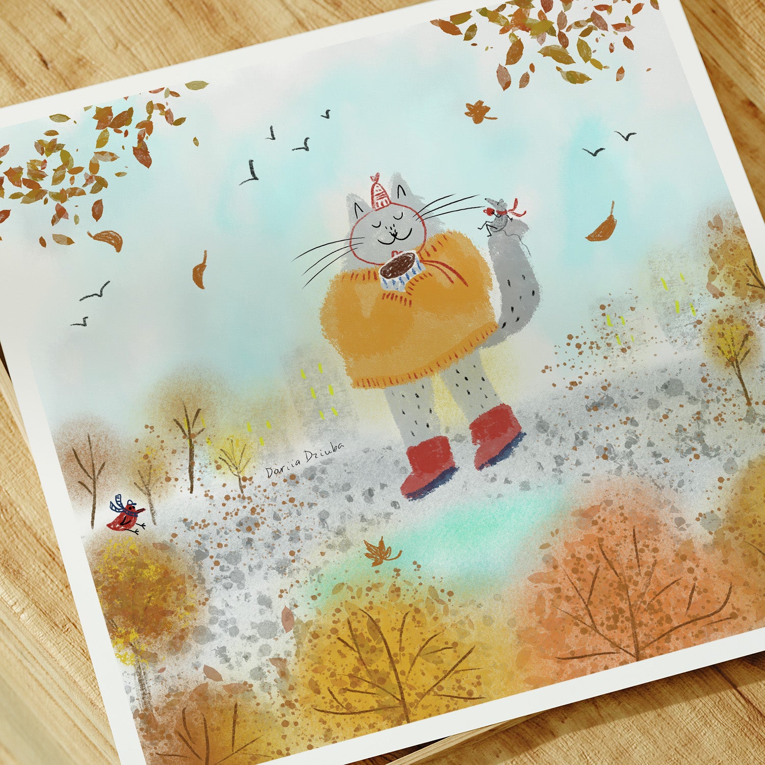 The art print of a kitty and a mouse in a fall park is printed on high quality fine art paper.