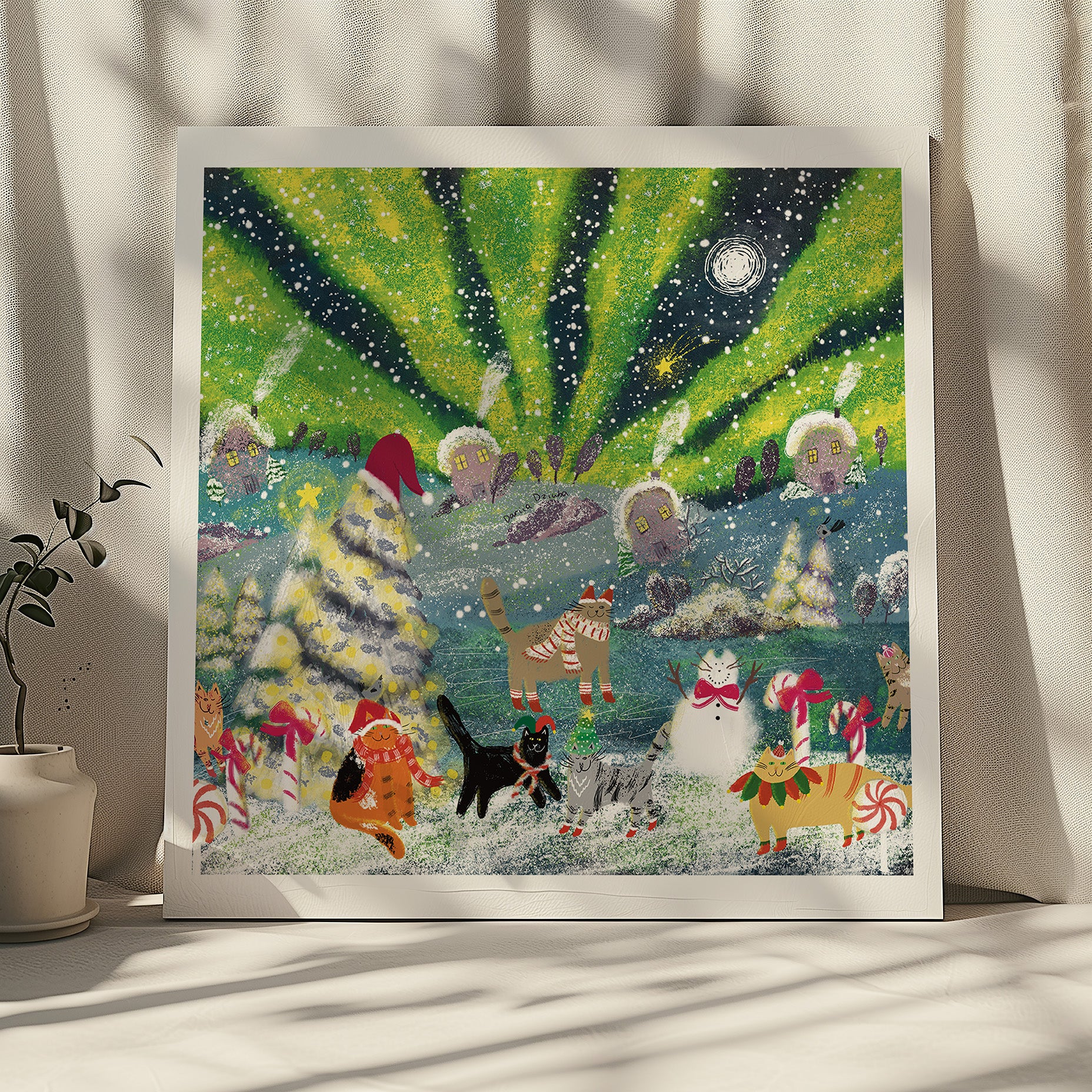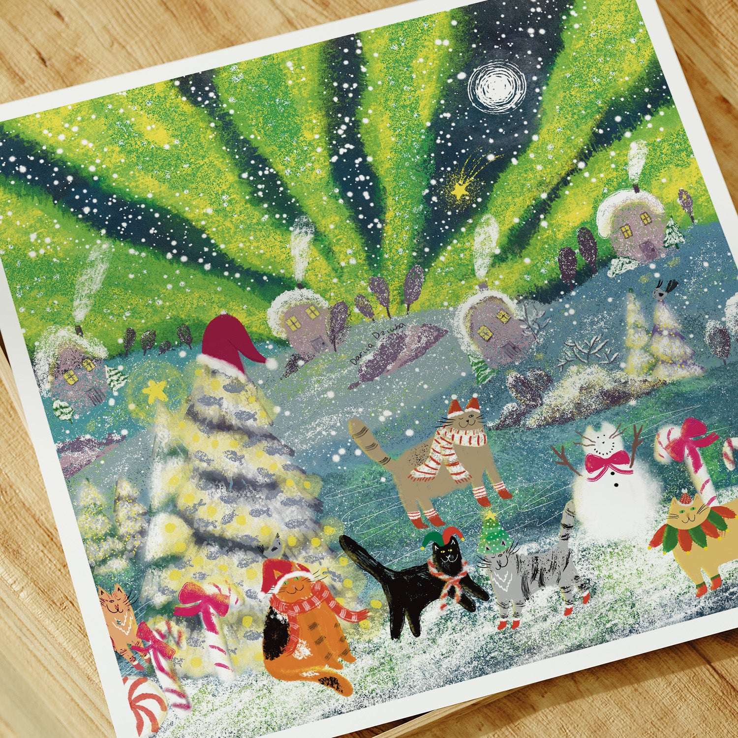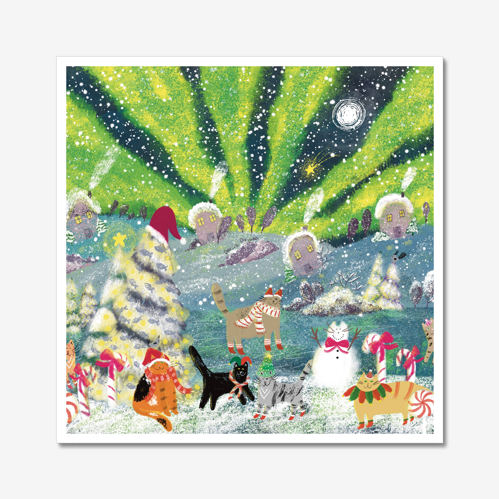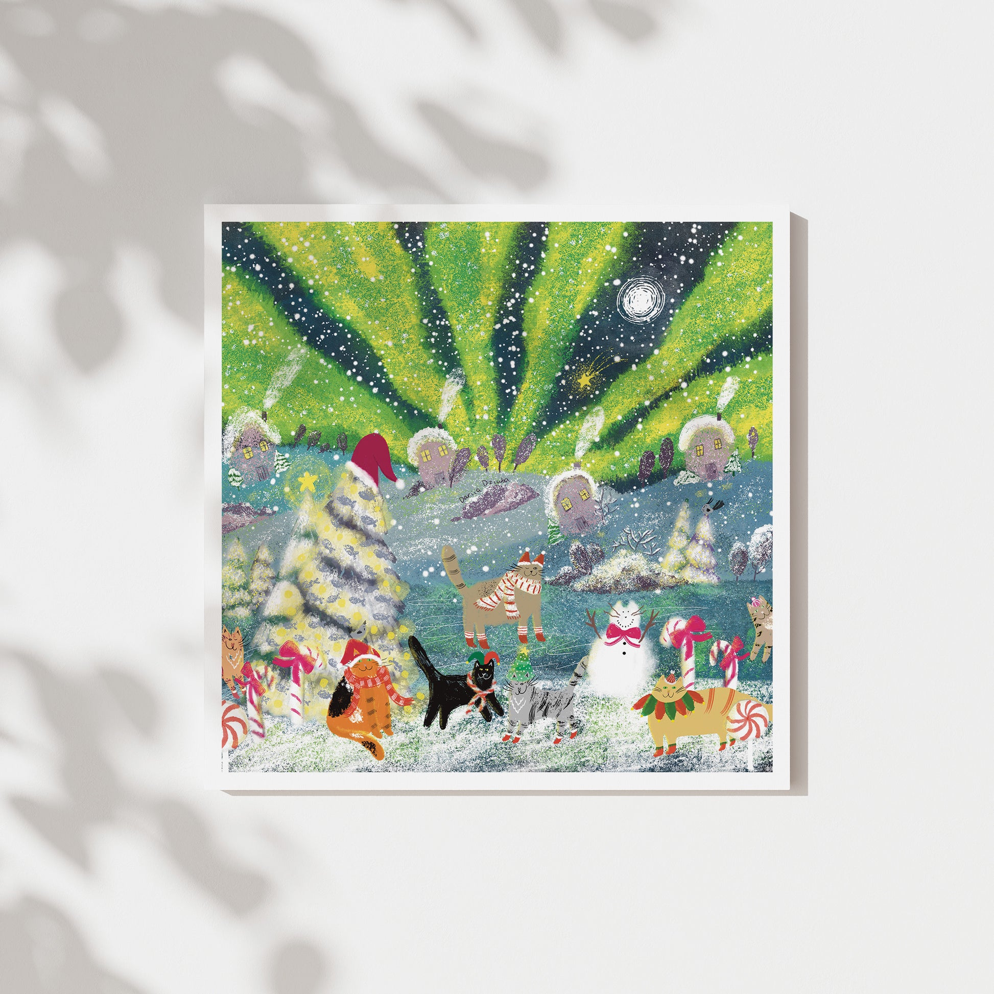 The art print of festive winter cats is printed on high quality fine art paper.