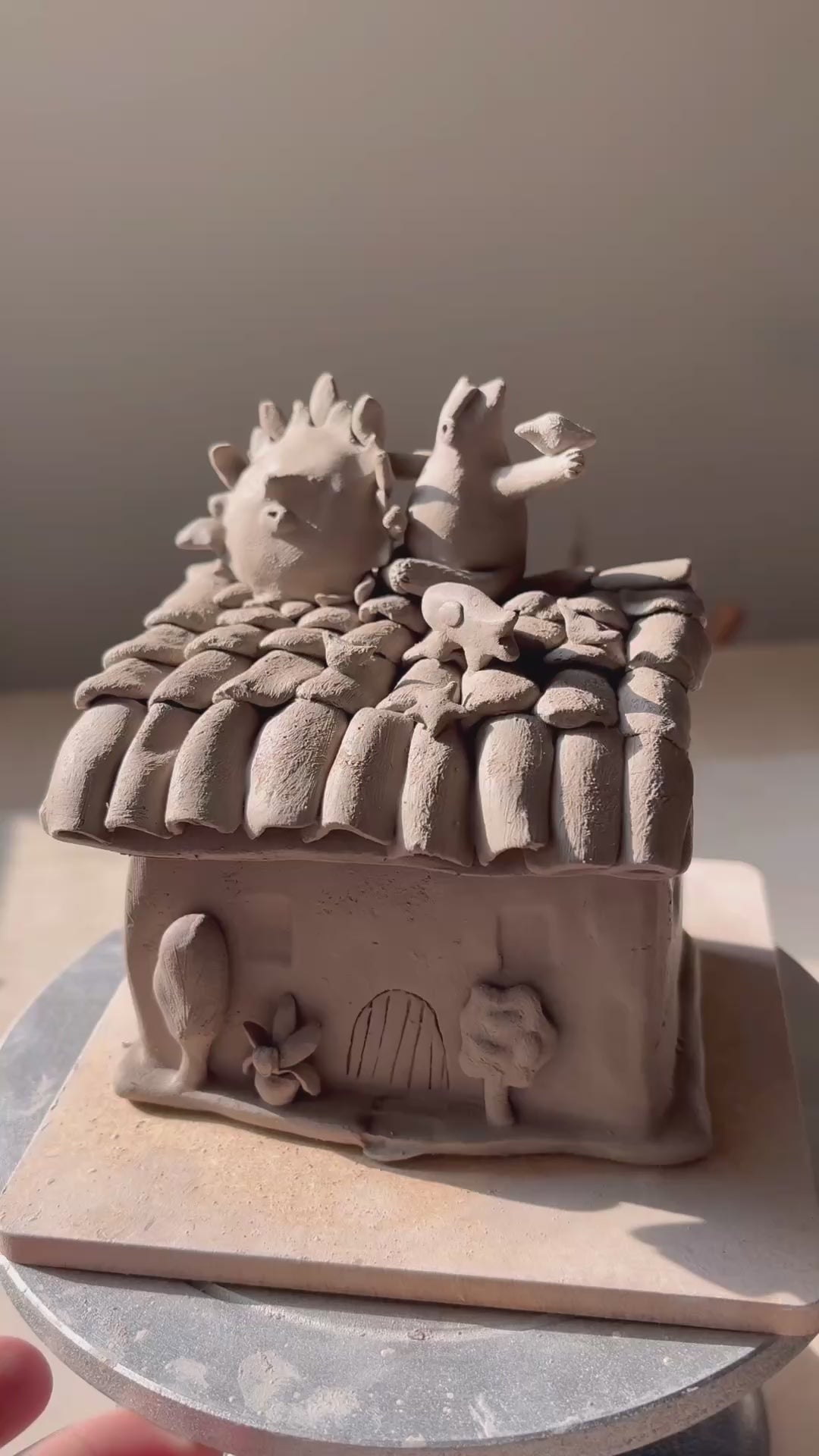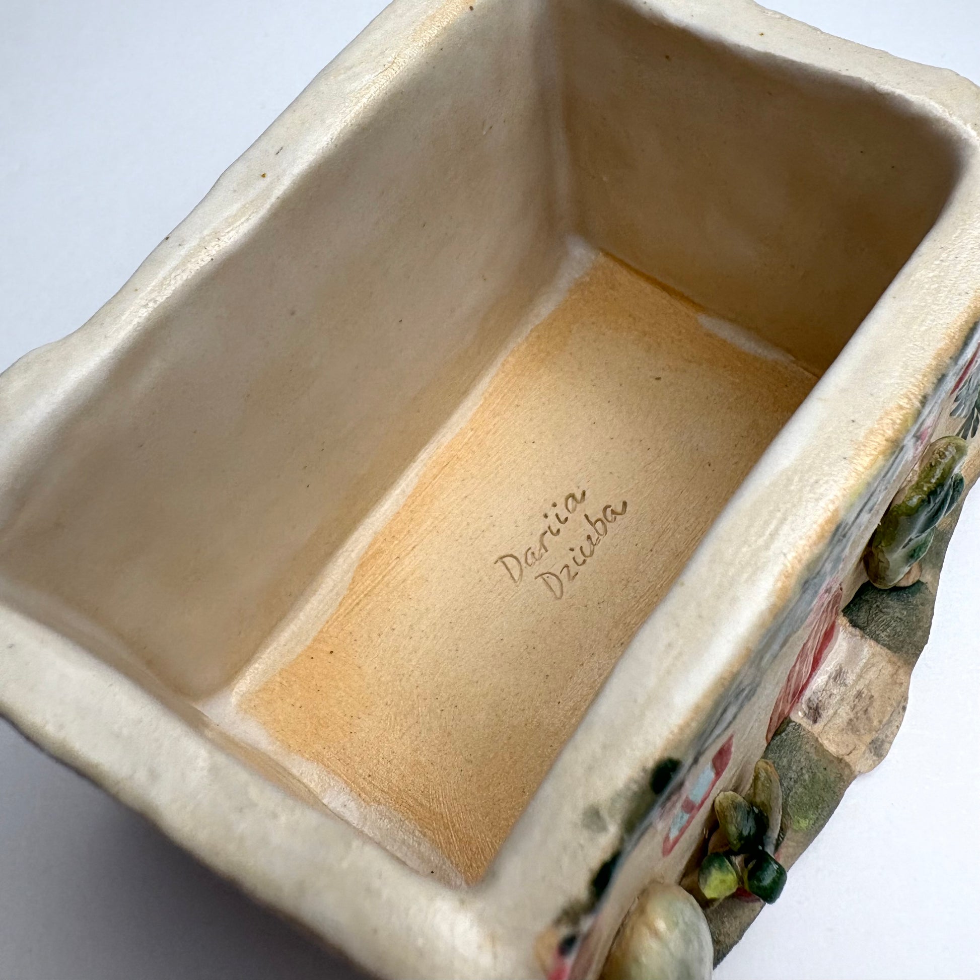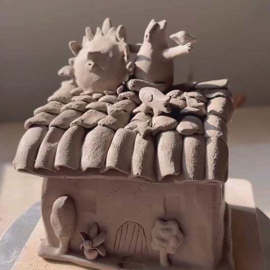 This whimsical ceramic cat is both a sculpture and an art box — a small character who carries his home and his friendships with him wherever he goes. Resting on his back is a tiny bird perched beneath a miniature house with a terracotta-style tiled roof, and he’s joined by a separate four-legged fish companion who completes the little travelling crew. Every element is hand-sculpted, from the cat’s stretched paws to the tiny roof tiles on the house. The cat’s body opens into a lidded box with a snug, organic fit, revealing a small compartment sized for keepsakes, notes, or any tiny treasures you want to tuck away. Made from white clay, hand-painted with underglazes, and finished with a soft, muted glaze palette, the piece was fired twice in the kiln. It measures about 3.5”×2”×2.7” (9×5×7 cm), with the inner space around 2.1”×1.6”×2” (5.5×4×5 cm). This is a one-of-a-kind artistic collector item — full of personality, narrative, and that warm, whimsical charm handmade ceramics can carry so well.