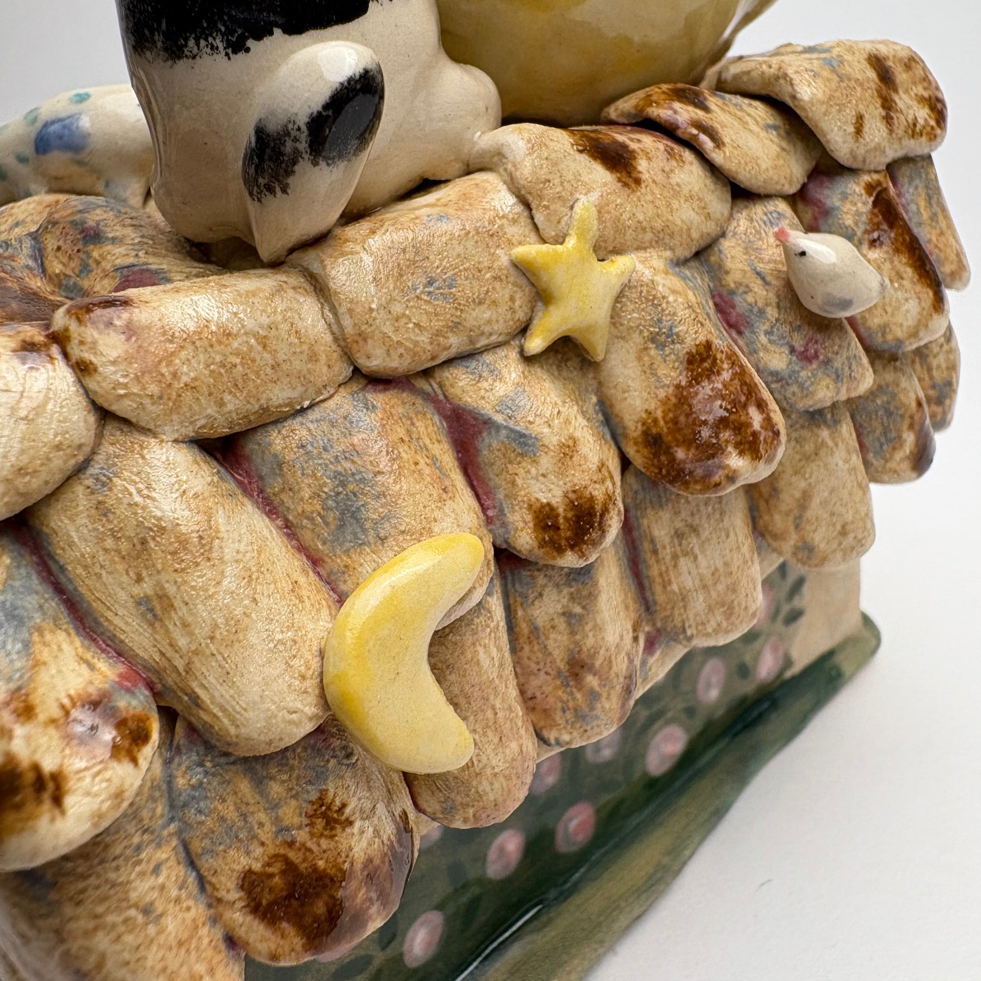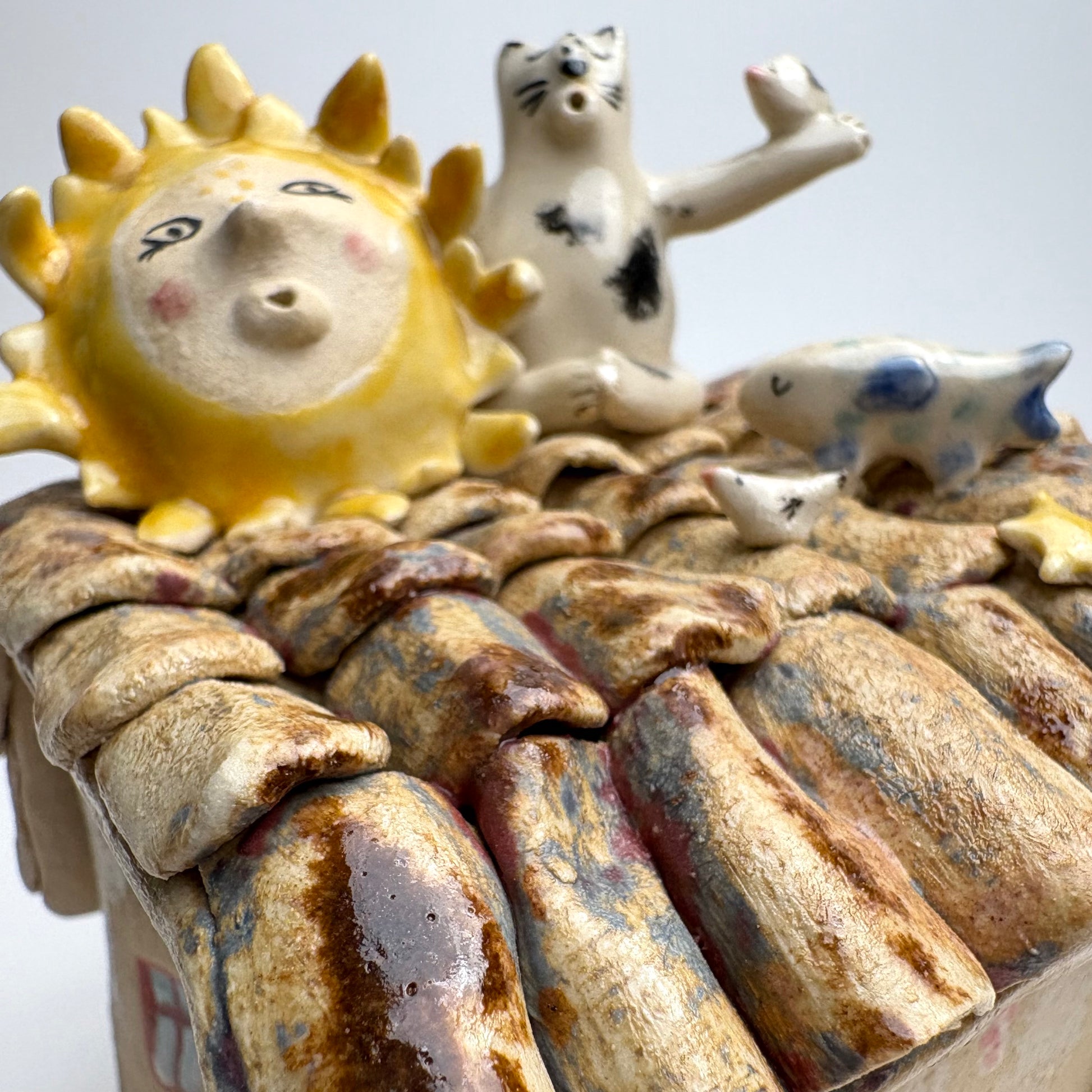 Whimsical Ceramic House Art Box with Cat, Sun, Birds & Four-Legged Fish — Hand-Sculpted Collector Piece